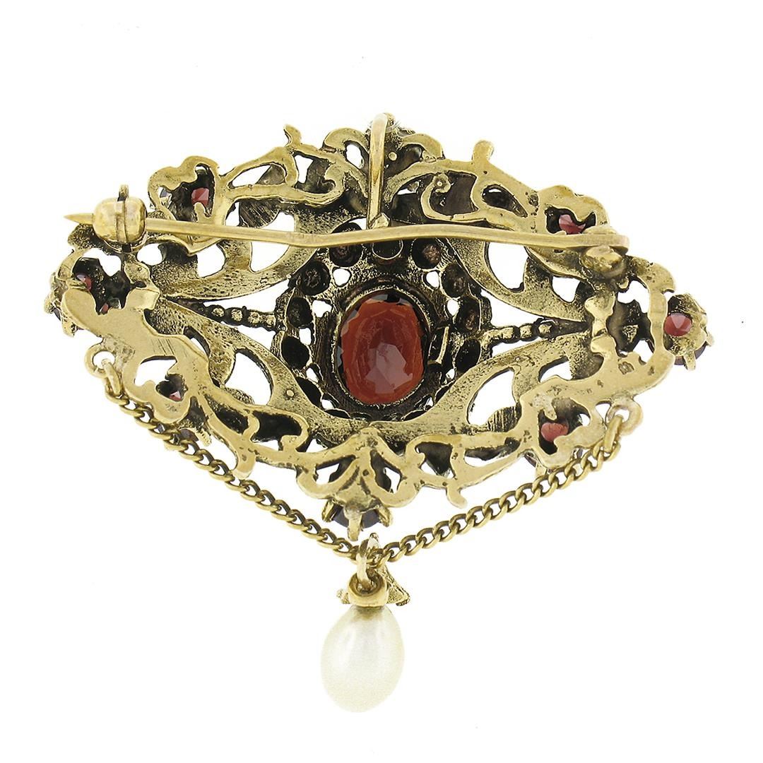 A solid 14k yellow gold dangle pin brooch pendant, with 10 round and oval cut natural garnets (4.0ctw), and 1 oval shape cultured pearl (7.1x5.8mm), and 1 round shape cultured seed pearl (1mm). Measures 28.0x41.75mm and weighs a total of 12.17 grams.