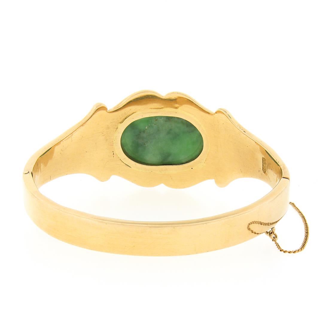 A vintage solid 14k yellow gold bangle bracelet, with 1 oval cabochon cut natural jade (22.6x15mm). It weighs a total of 38.59 grams, measures 26.10mm wide, and measures 6 inches in length.