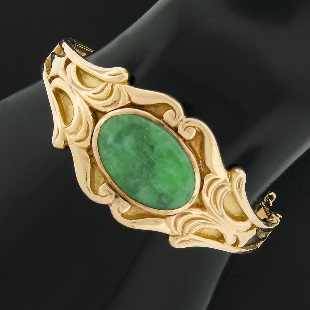 A vintage solid 14k yellow gold bangle bracelet, with 1 oval cabochon cut natural jade (22.6x15mm). It weighs a total of 38.59 grams, measures 26.10mm wide, and measures 6 inches in length.