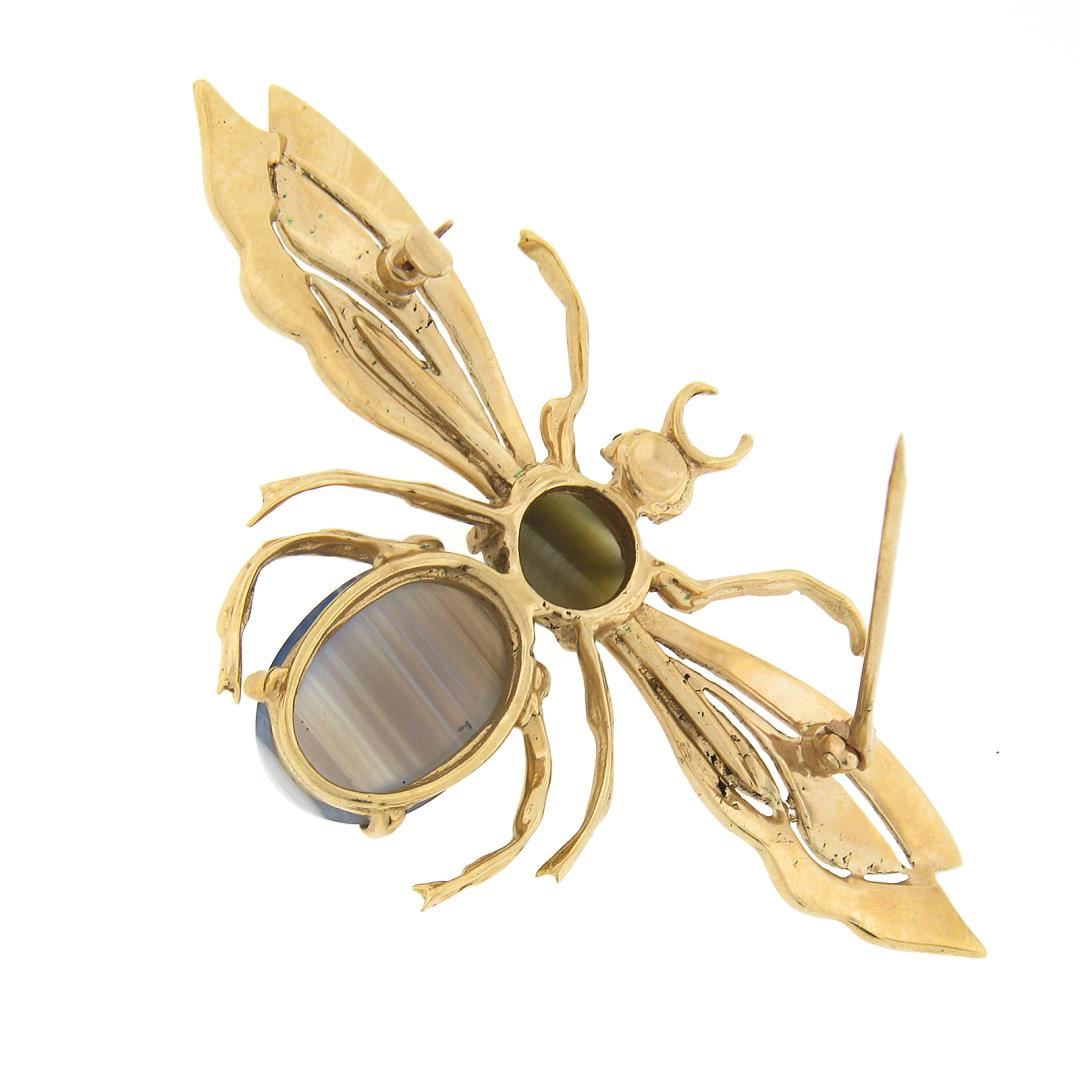 A vintage solid 14k yellow gold brooch, with 1 oval cabochon natural banded agate (17.9x12.9mm ), 1 oval cabochon cut natrual tigers eye (17.9x12.9mm ), 2 round brilliant cut natrual trsavorites (0.05ctw), and 49 round shape cultured pearls (2.6-1.1mm each). Measures 36x69.1mm and weighs a total of 15.24 grams.