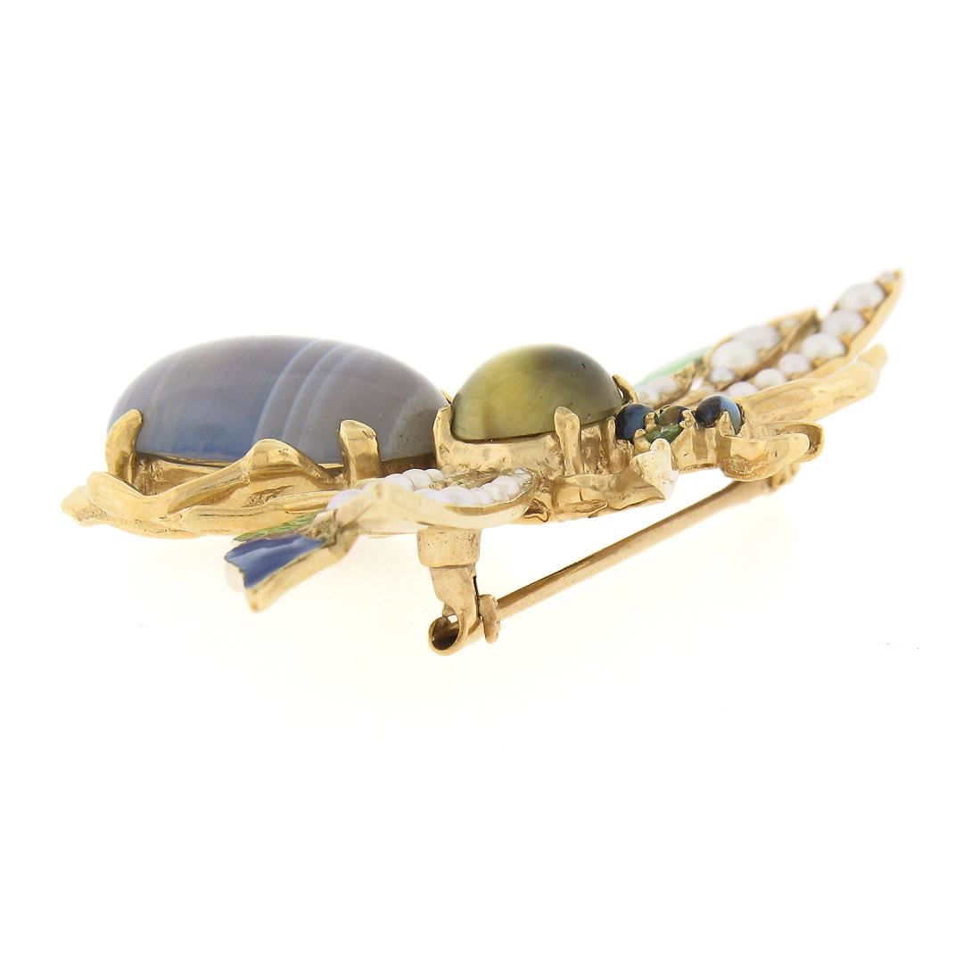 A vintage solid 14k yellow gold brooch, with 1 oval cabochon natural banded agate (17.9x12.9mm ), 1 oval cabochon cut natrual tigers eye (17.9x12.9mm ), 2 round brilliant cut natrual trsavorites (0.05ctw), and 49 round shape cultured pearls (2.6-1.1mm each). Measures 36x69.1mm and weighs a total of 15.24 grams.