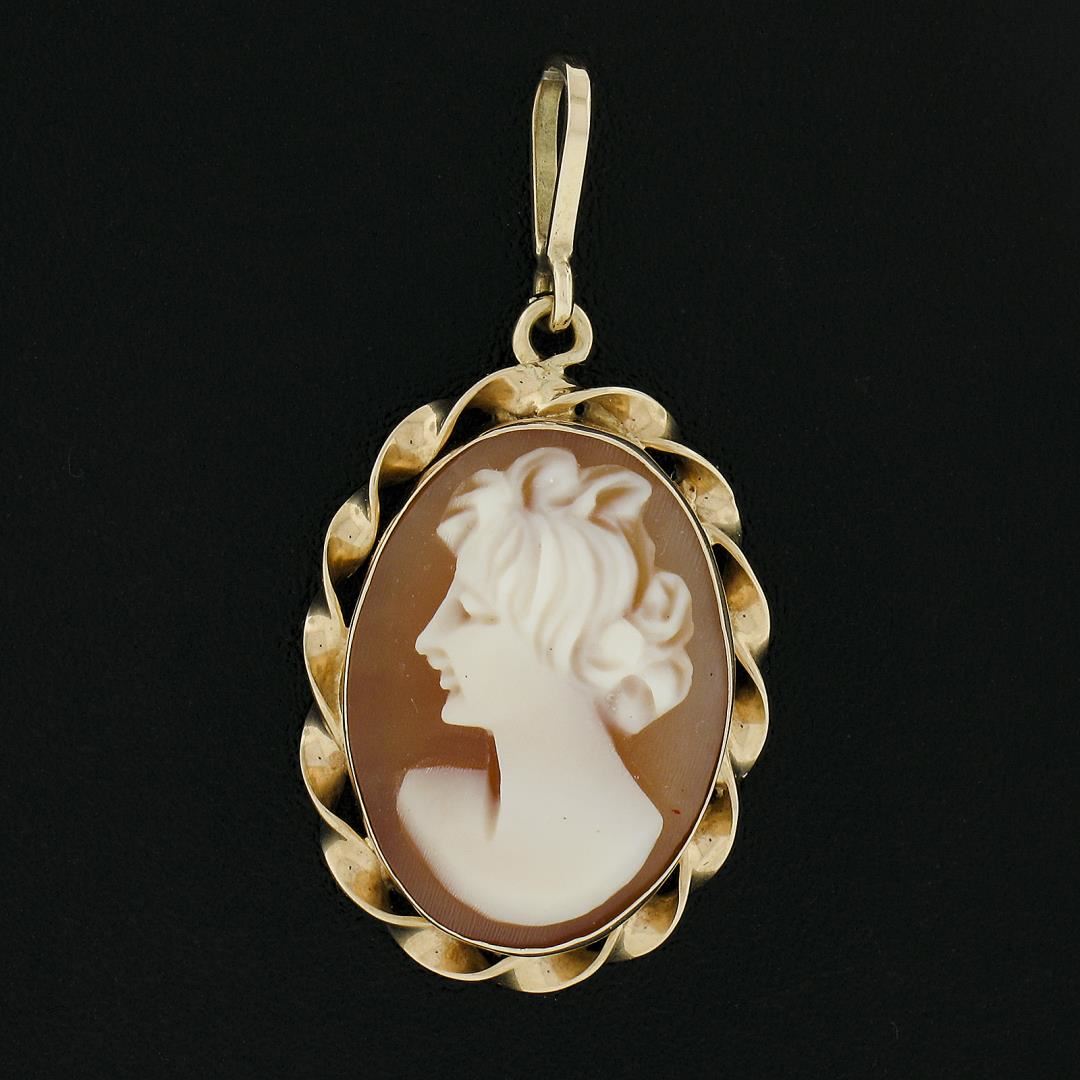 A vintage solid 14k yellow gold pendant, with 1 oval carved cameo shell ( 17x12.5mm). The pendant weighs a total of 2.48 grams, measures 31.6x16mm including the bail, and the inside of the bail measures 5.8x3.4mm.