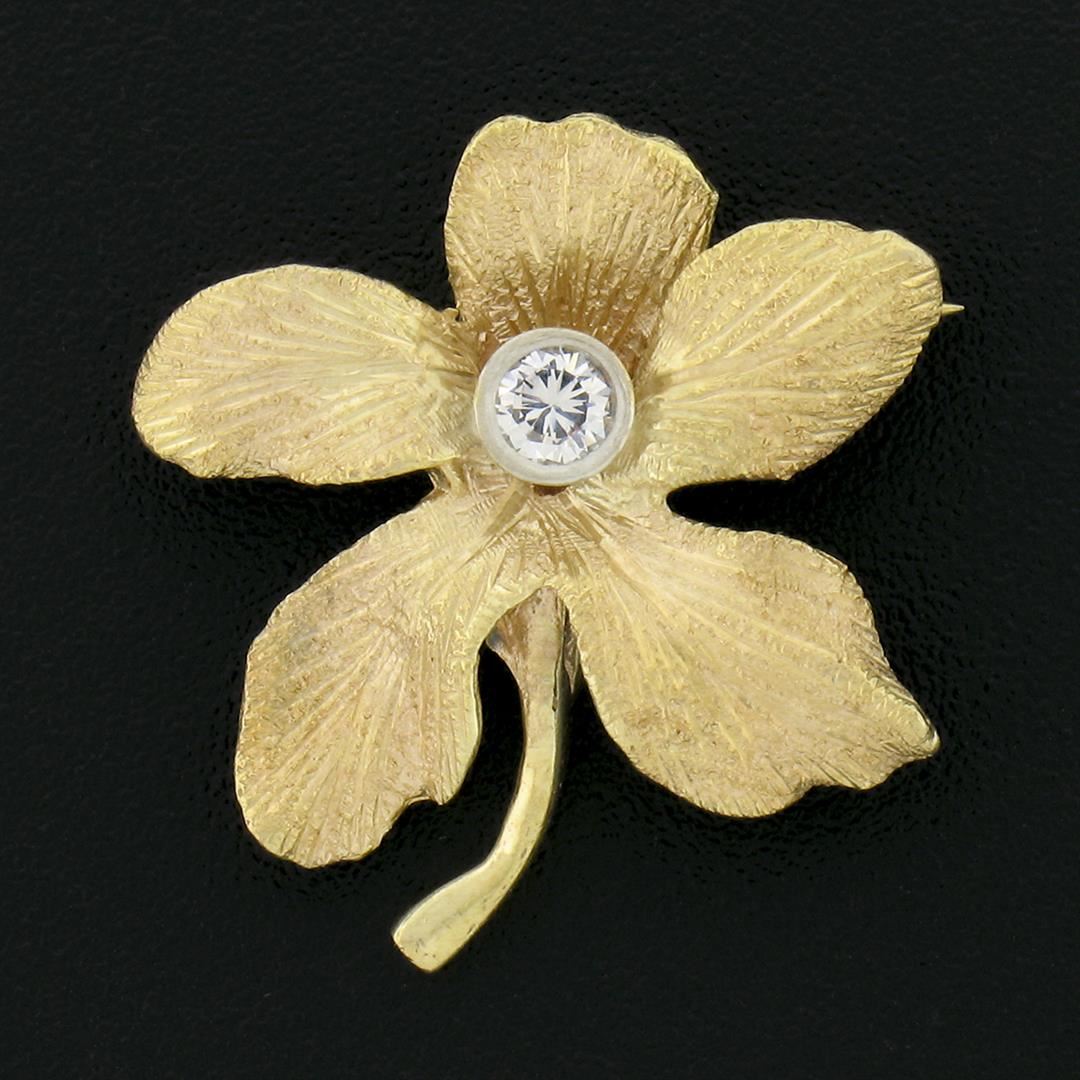 Vintage 14k Gold Bezel Cubic Zirconia Cz Textured Leaf Flower Petite Brooch Pin