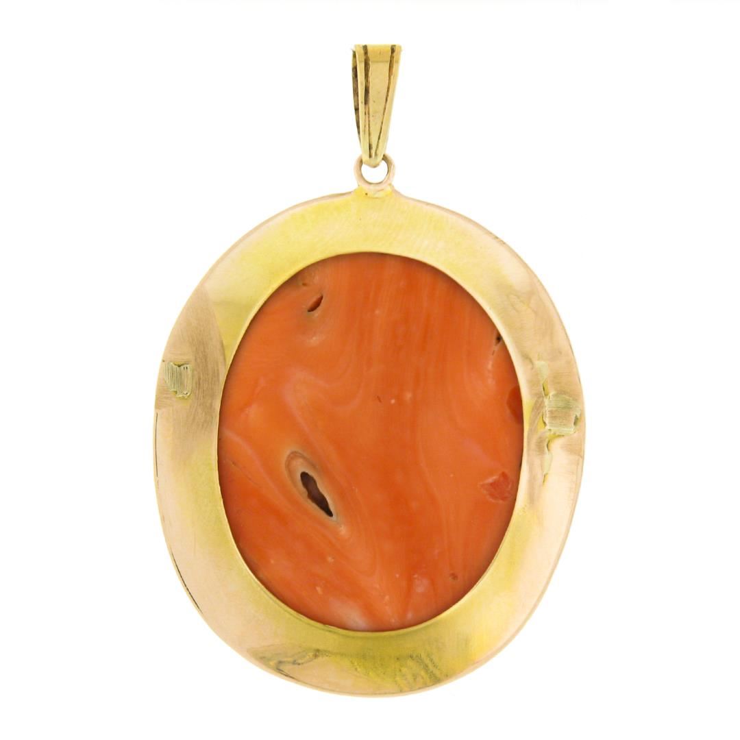 A vintage solid 14k yellow gold pendant, with 1 oval shape carbed cameo natural coral (33x27.9mm ). The pendant weighs a total of 13.57 grams, measures 53.8x35.8mm including the bail, and the inside of the bail measures 8.3x3.3mm.