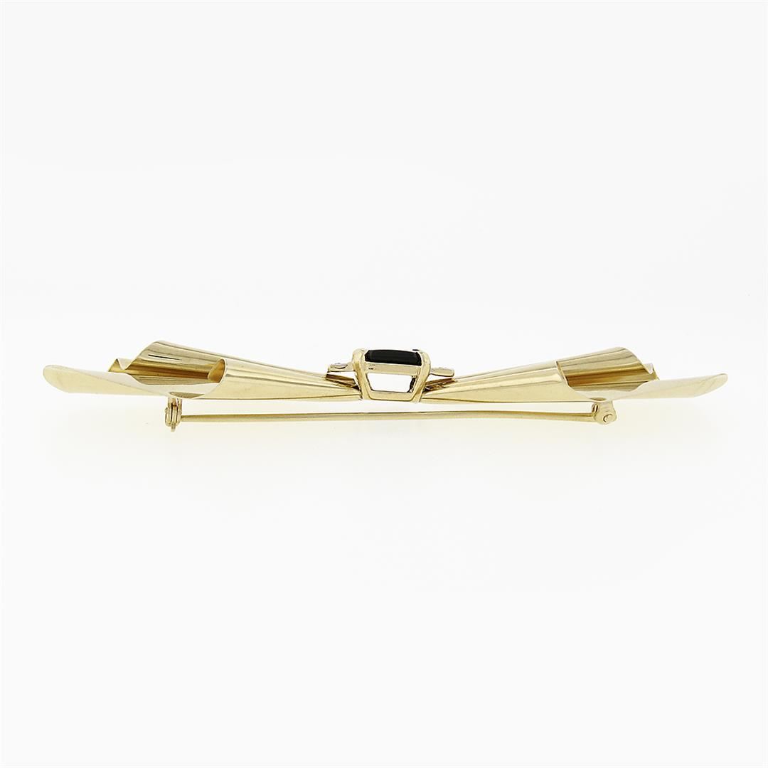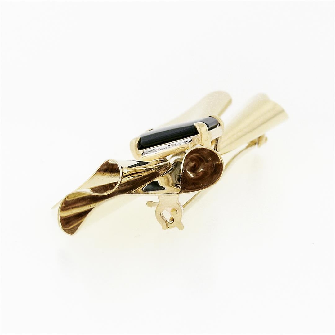A vintage solid 14k yellow gold ribbon pin brooch, with 1 rectangular brooch cut natural black onyx (10.1x81mm), and 6 old single cut natural diamonds (G/H - SI2 ; 0.06ctw). Measures 21.2x77.1mm and weighs a total of 7.79 grams.