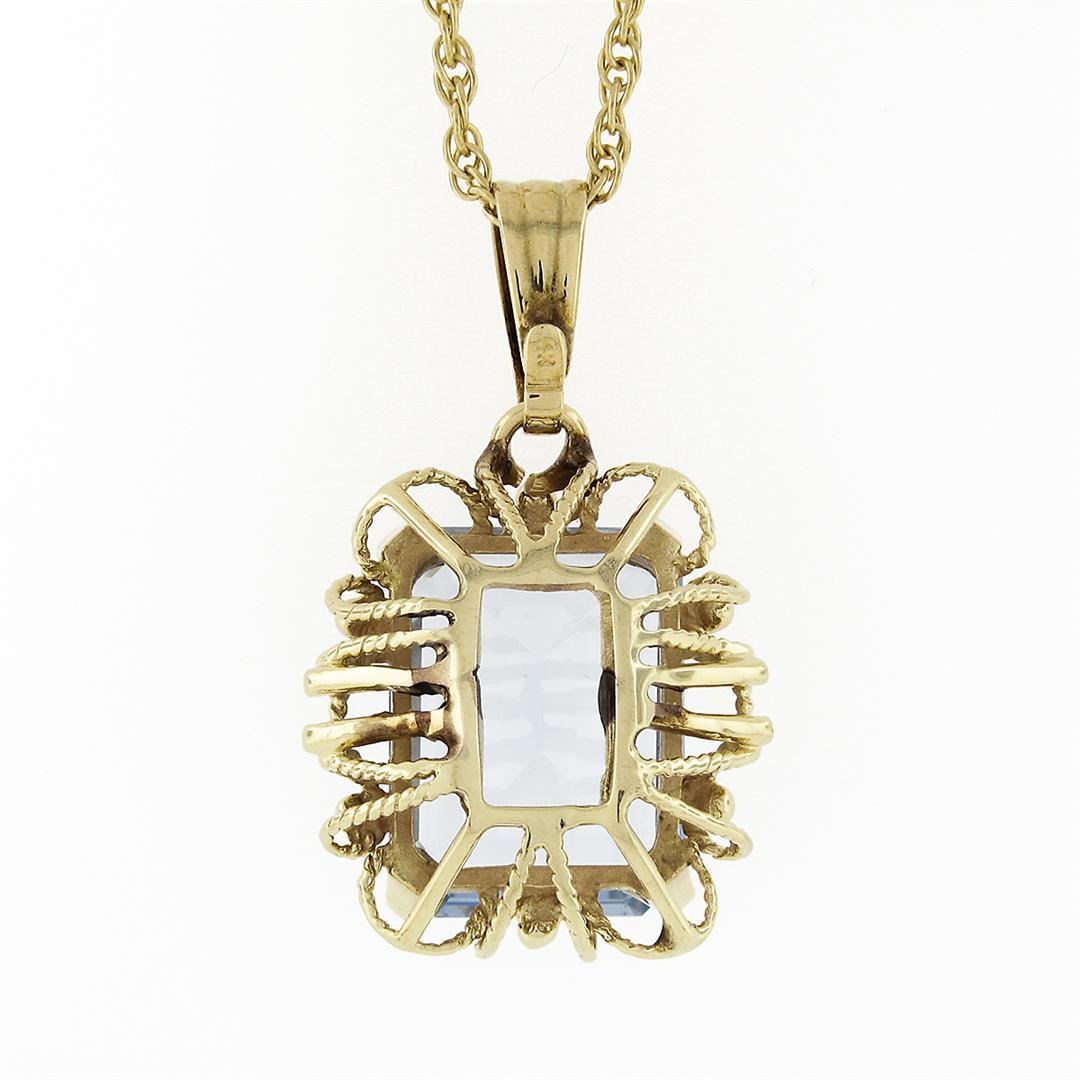 A vintage solid 14k yellow gold solitaire pendant necklace, with 1 rectangular cut blue stone (16.1x12.2mm). 18 inch rope link chain, 9.1 grams total weight, pendant measures 31.6x19mm.