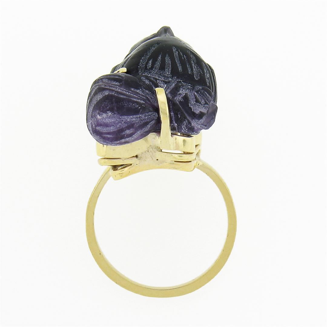 A solid 14k yellow gold ring, with 1 3d carved natural amethyst (25.6x16.5mm). The ring is size 7.5, weighs a total of 12.68 grams, and measures 28.40mm wide.