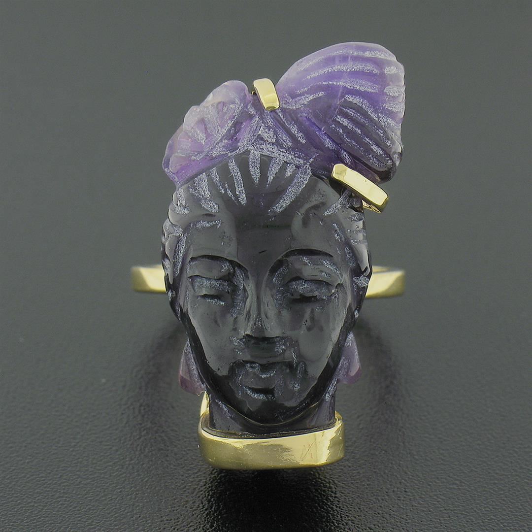A solid 14k yellow gold ring, with 1 3d carved natural amethyst (25.6x16.5mm). The ring is size 7.5, weighs a total of 12.68 grams, and measures 28.40mm wide.