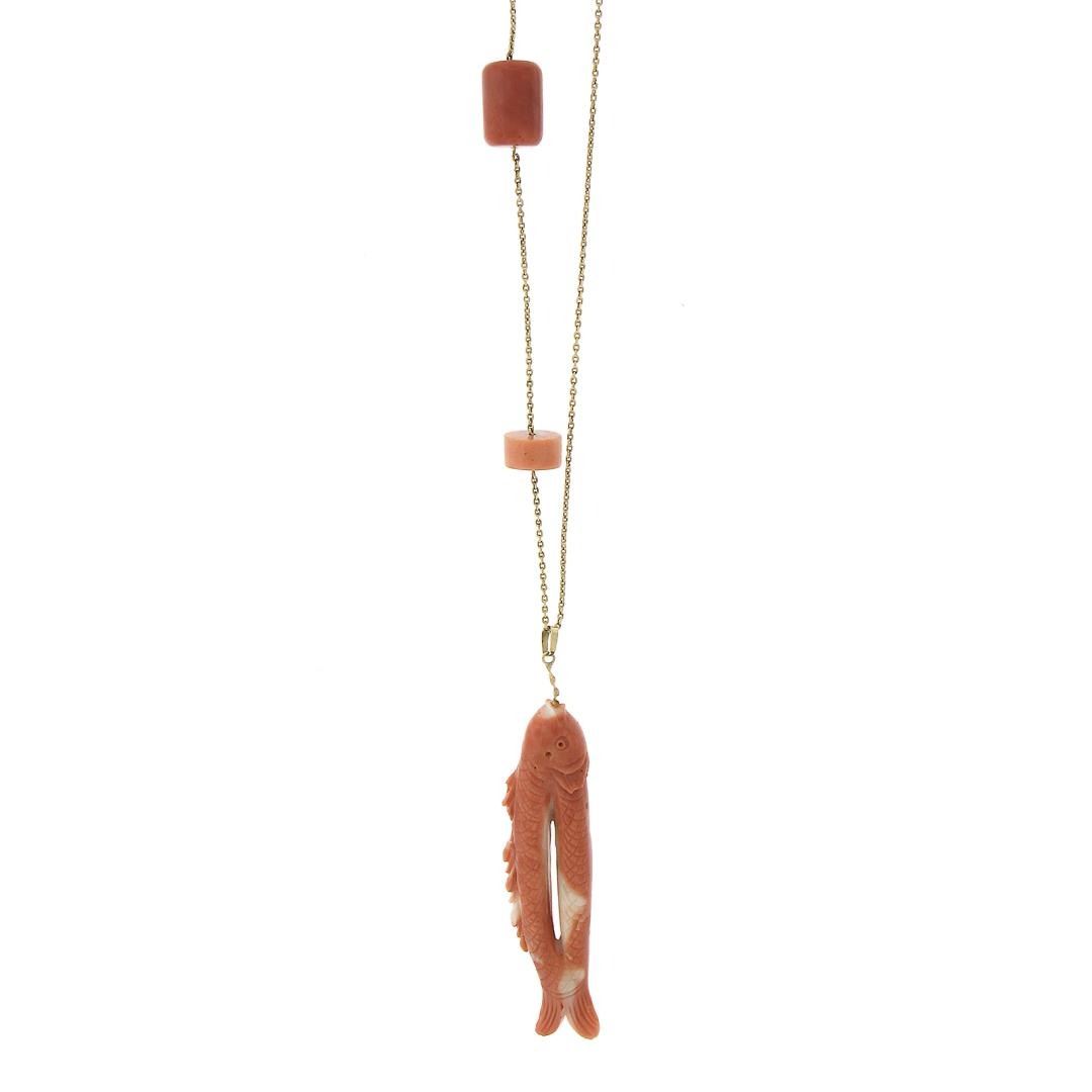 Vintage 14k Gold Carved Coral Fish on Line Pendant & Tubes on Chain Necklace