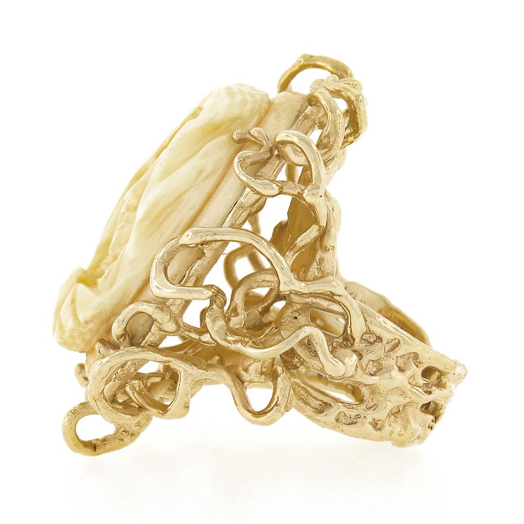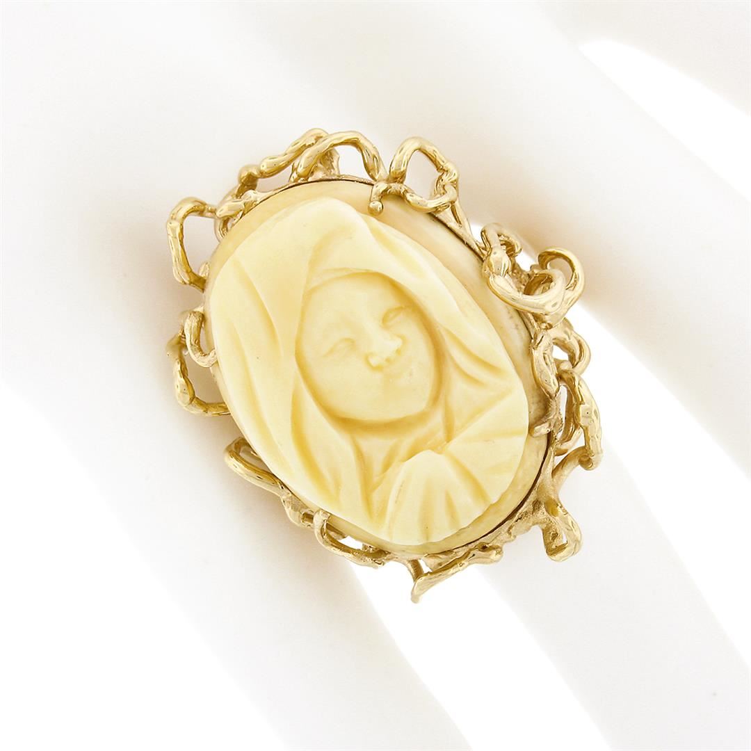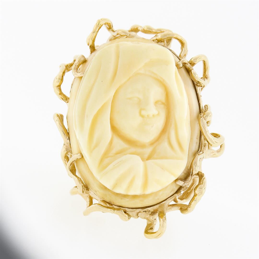 A vintage solid 14k yellow gold ring, with 1 carved oval shape cameo (29.90x22.80mm). The ring is size 7.5, weighs a total of 22.12 grams, and measures 39.20mm wide.
