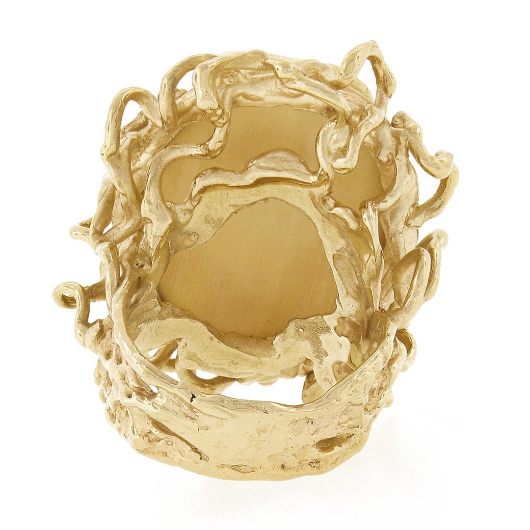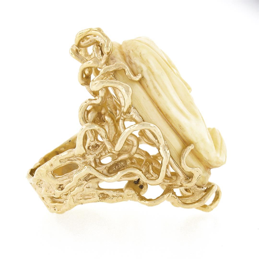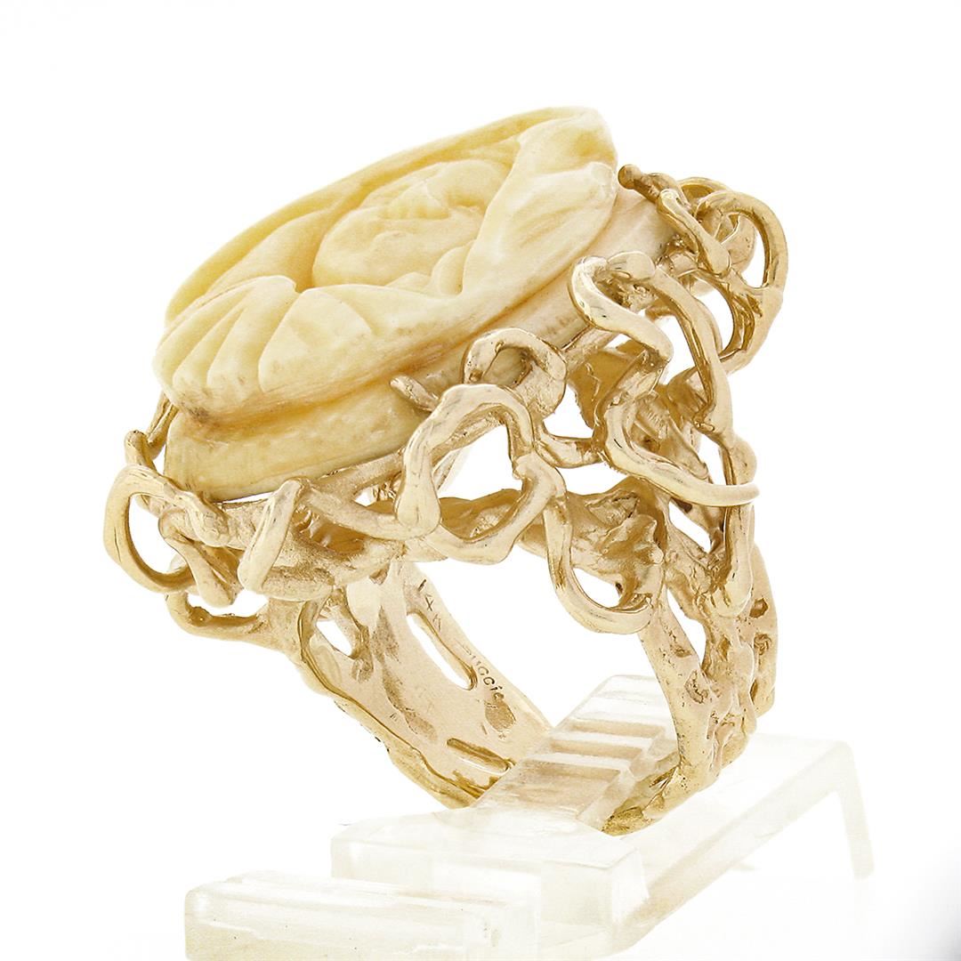 A vintage solid 14k yellow gold ring, with 1 carved oval shape cameo (29.90x22.80mm). The ring is size 7.5, weighs a total of 22.12 grams, and measures 39.20mm wide.