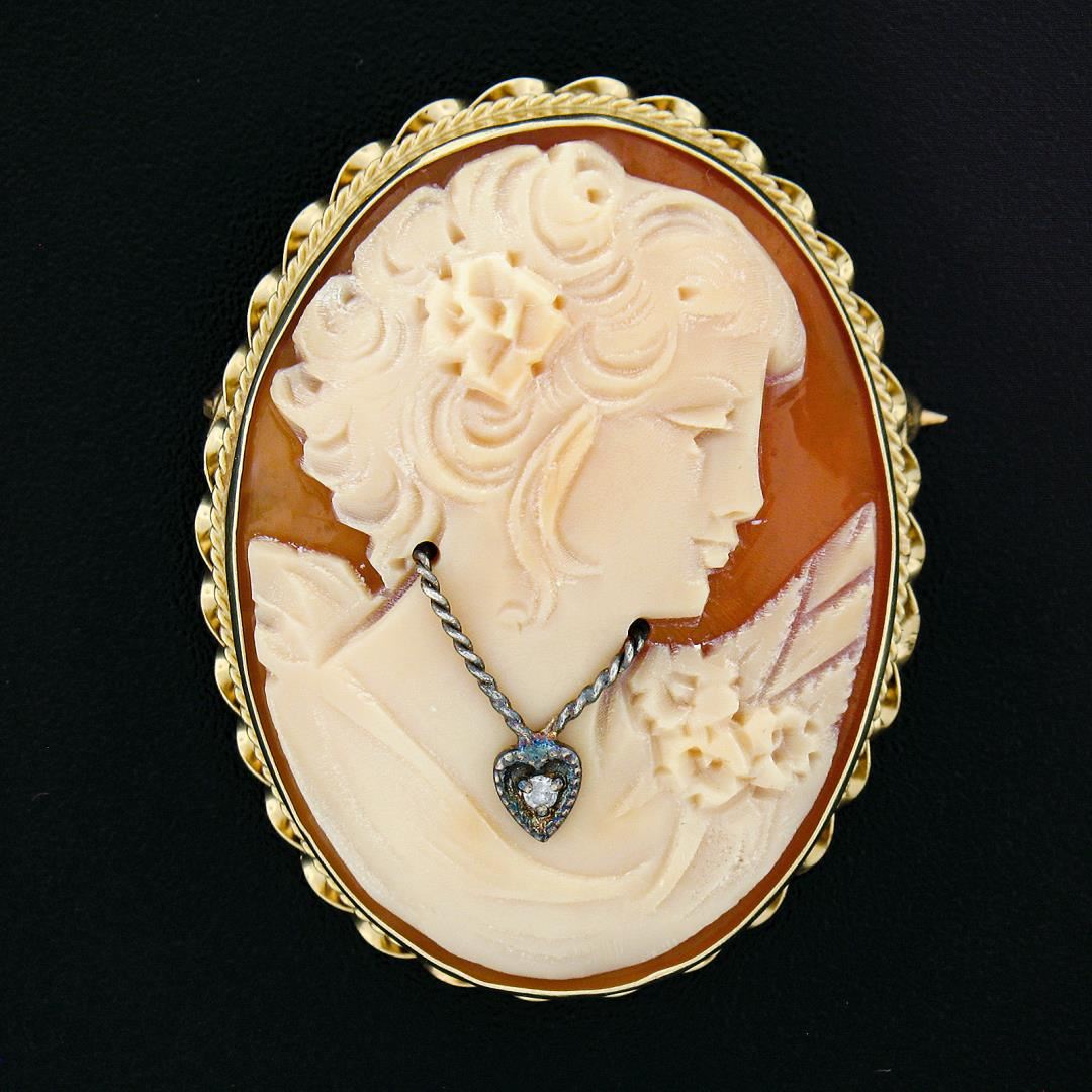 A vintage solid 14k yellow gold brooch, with 1 oval shape carved cameo shell (34.8x26.2mm), and 1 old single cut natrual diamond (G/H - I2-3 ; 0.02ct). Measures 37.9x29.8mm and weighs a total of 6.44 grams.