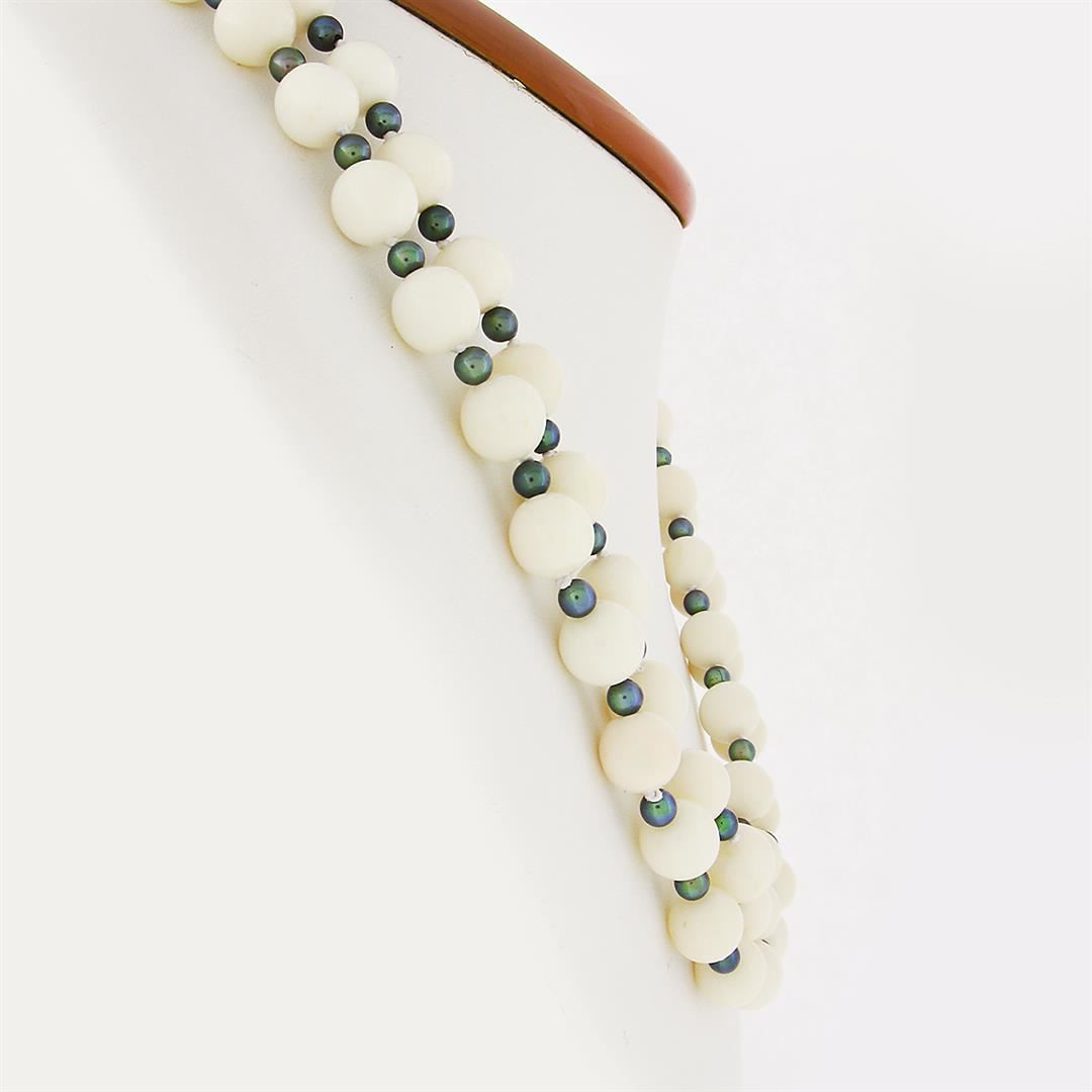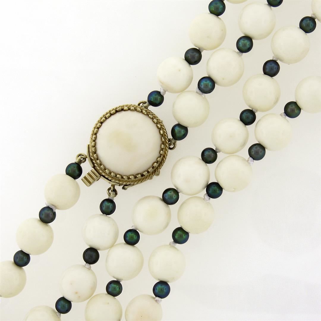 A vintage strand necklace with 14k yellow gold clasp, featuring 66 round shape angel skin corals (8.8-9.75mm each), 67 round shape natural gray pearls (4.0-4.2mm each), and 1 round cabochon cut natural coral (17.0mm). 18 inch dual strand link chain, 86.16 grams total weight, clasp diameter measures19.75mm.