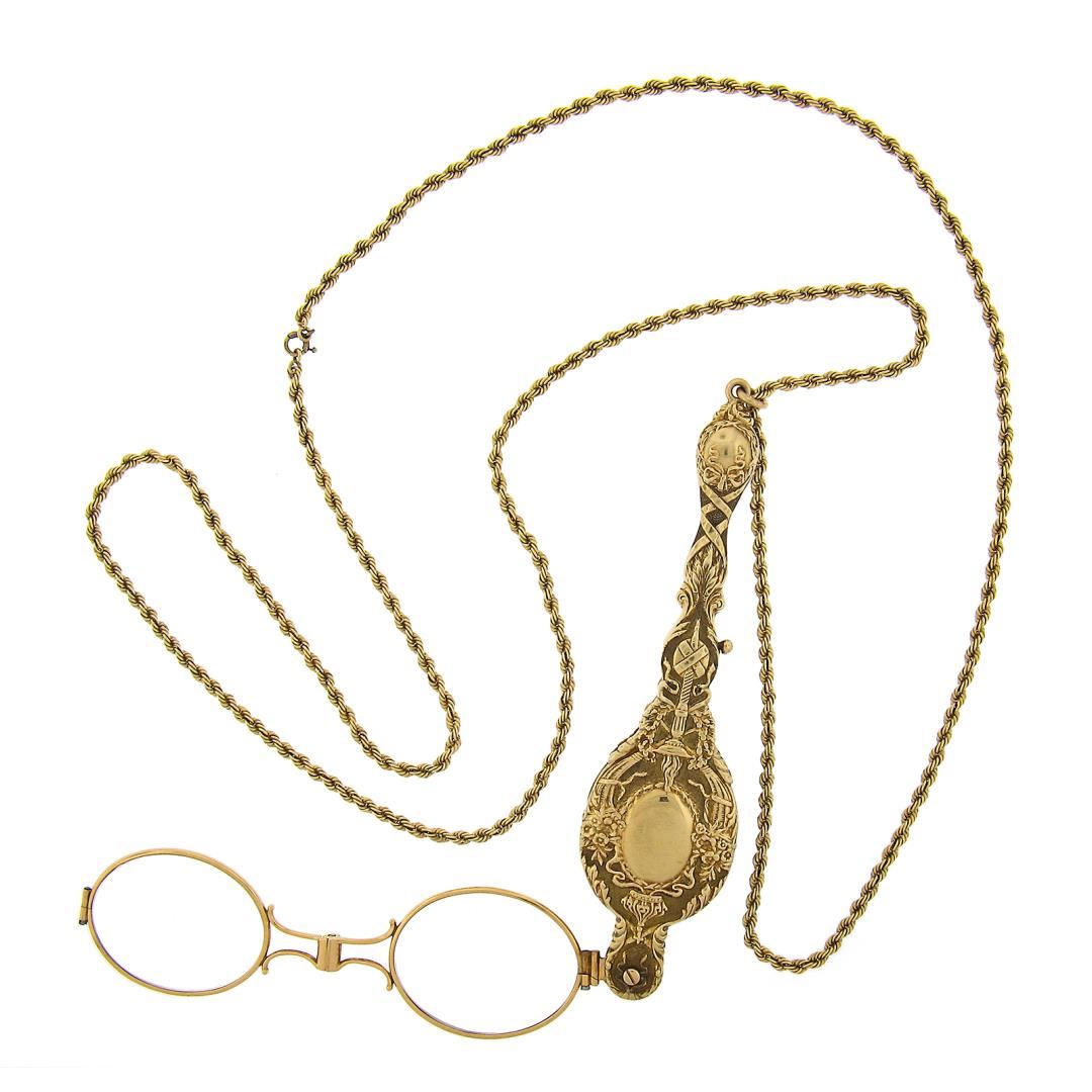 A vintage solid 14k yellow gold lorgnette opera glasses chain necklace. 35 inch rope link chain, 56.16 grams total weight, Lorgnette measures 114.3x28.4mm.