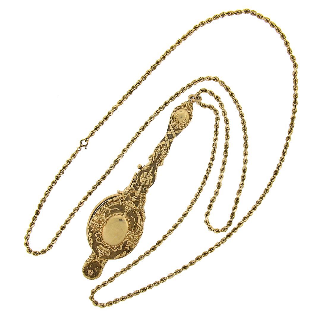 A vintage solid 14k yellow gold lorgnette opera glasses chain necklace. 35 inch rope link chain, 56.16 grams total weight, Lorgnette measures 114.3x28.4mm.