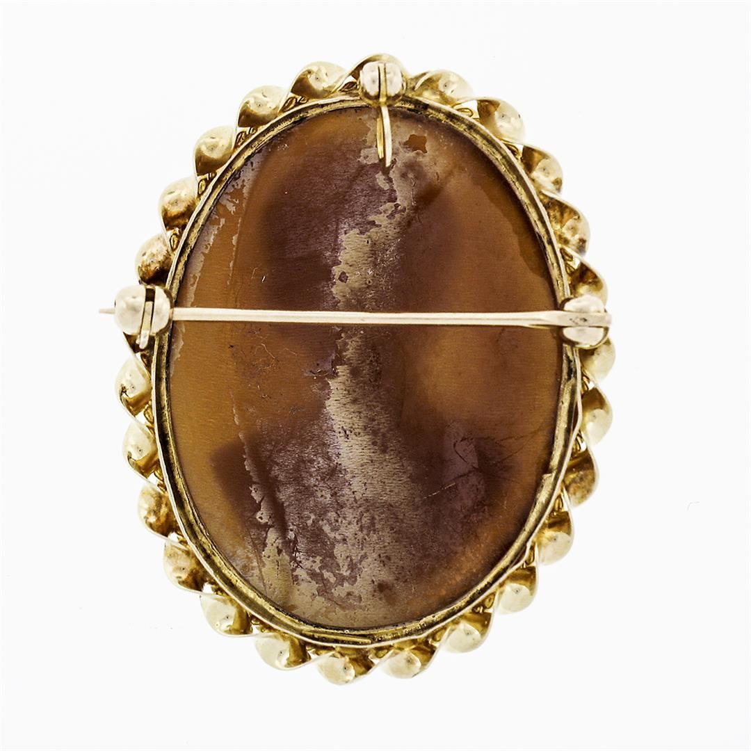 A vintage solid 14k yellow gold pendant pin brooch, with 1 oval cut carved shell cameo (29.5x22mm). Measures 35x27.5mm and weighs a total of 7.93 grams.