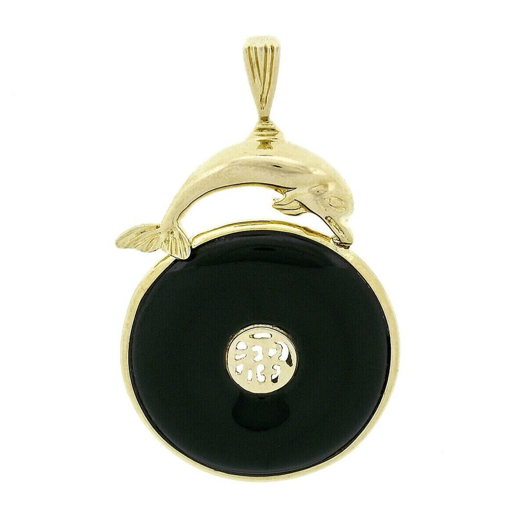 A vintage solid 14k yellow gold dolphin & chinese symbol pendant, with round brilliant cut natural jade (19.0mm). The pendant weighs a total of 3.0 grams, measures 33.8x#22mm including the bail, and the inside of the bail measures 5.2x2.85mm.