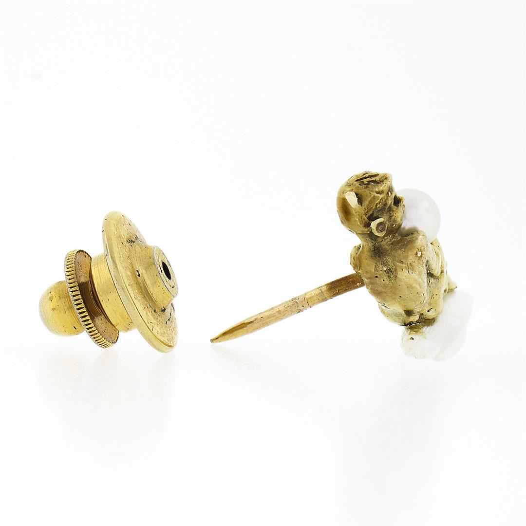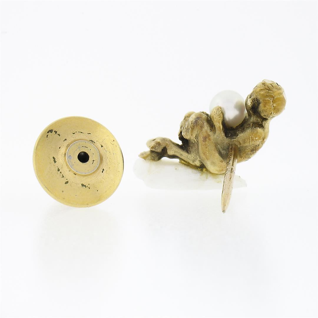 A vintage solid 14k yellow gold tie tack & cufflinks set, with 3 round shape cultured pearls ( (2) 3.85mm & (1) 4.3mm), and 3 carved natural freshwater pearls (17.7x10.1mm & 15.85x12.1mm & 13.5x5.25mm). These cuff links have a swivel design with a clearance of 14.1mm, weigh a total of 25.18 grams, and the front panels measure 24.0mm in diameter.