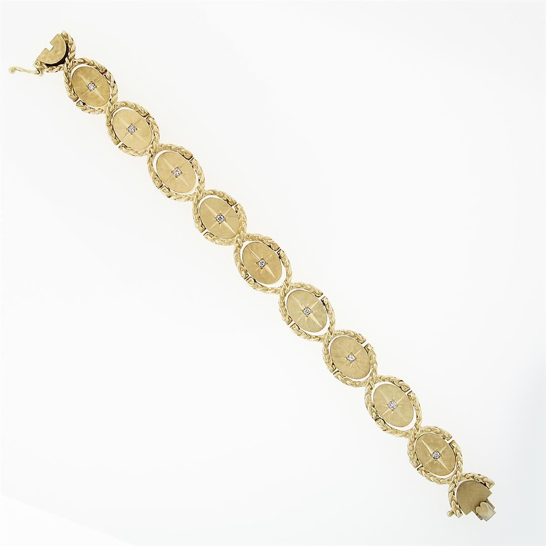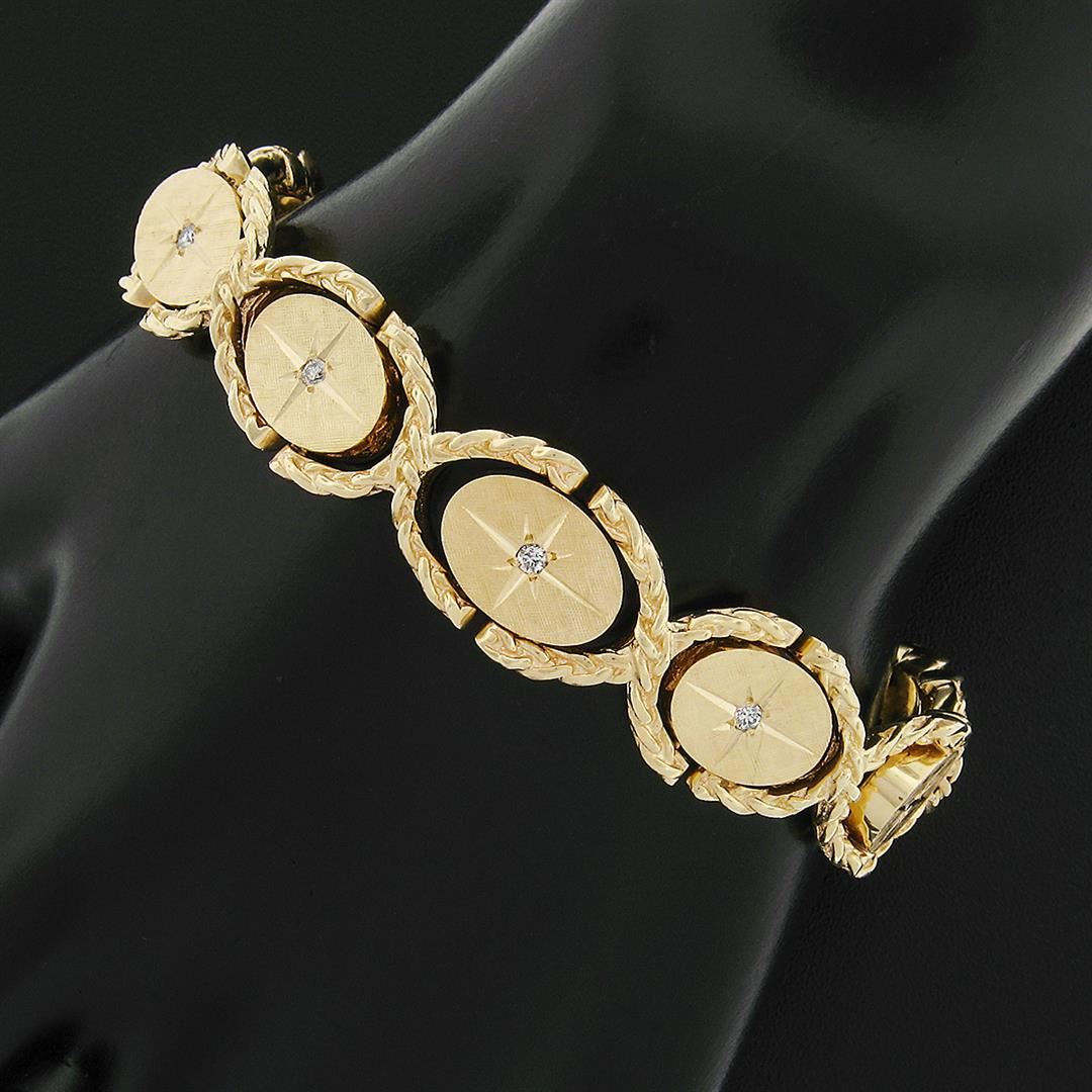A vintage solid 14k yellow gold oval link bracelet, featuring 9 old transitional cut natural diamonds (F - VS2 ; 0.14ctw). It weighs a total of 38.1 grams, measures 13.5mm wide, and measures 6.5 inches in length.