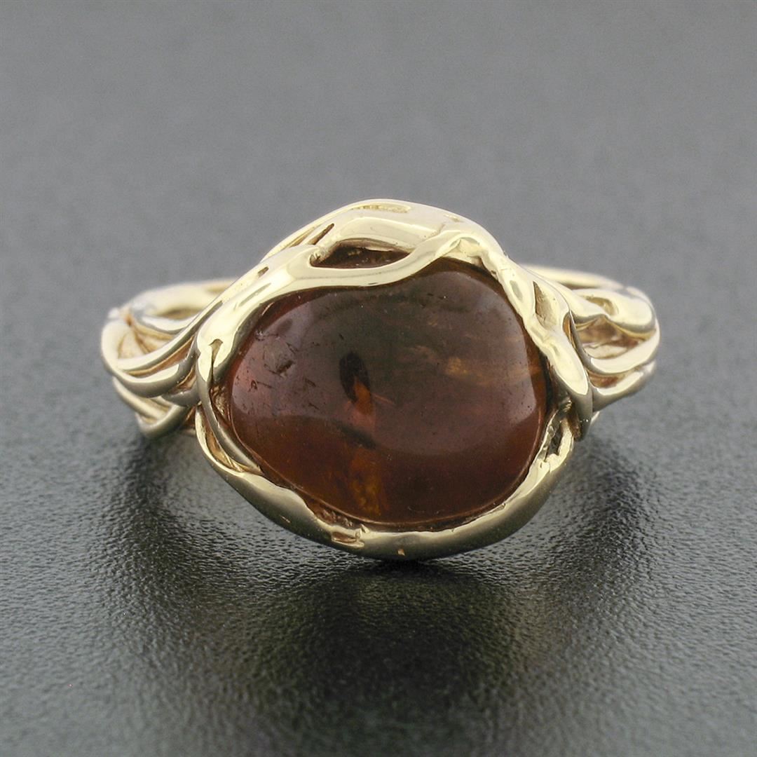 A vintage solid 14k yellow gold free from ring, with 1 semi oval cabochon cut natural amber (10.6x9.3mm). The ring is size 6.0, weighs a total of 6.38 grams, and measures 13.7mm wide.
