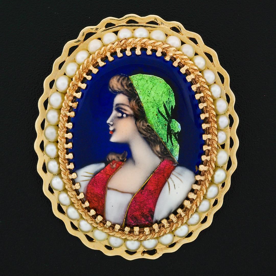 A vintage solid 14k yellow gold brooch or pendant with a hand painted portrait on porcelain surrounded with a halo of 36 round shape cultured pearls (2.5 to 2.9mm). Measures 41.23x33.91mm and weighs a total of 13.03 grams.