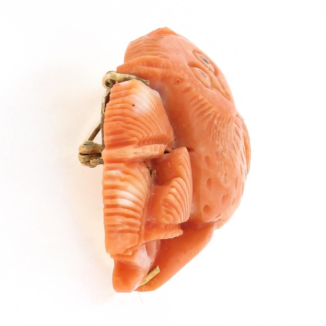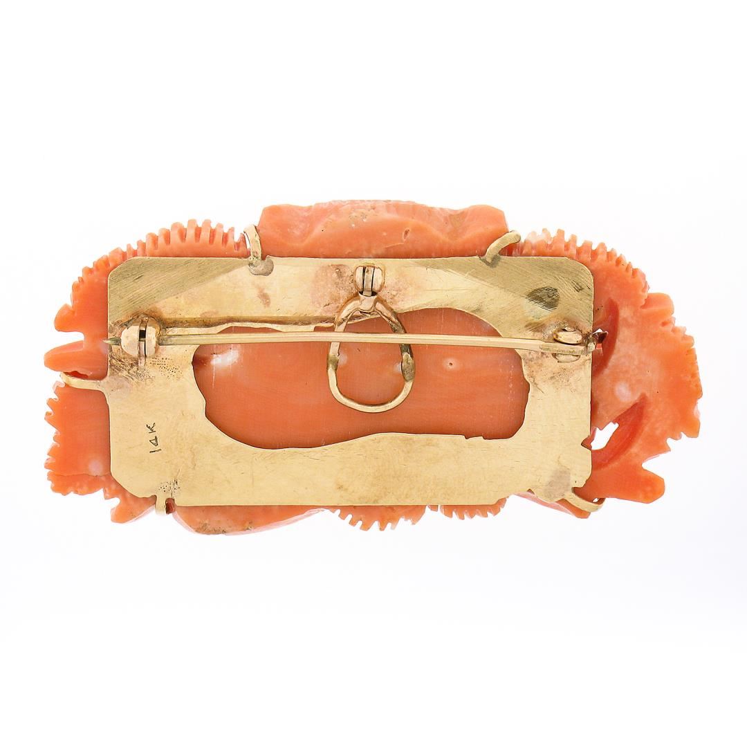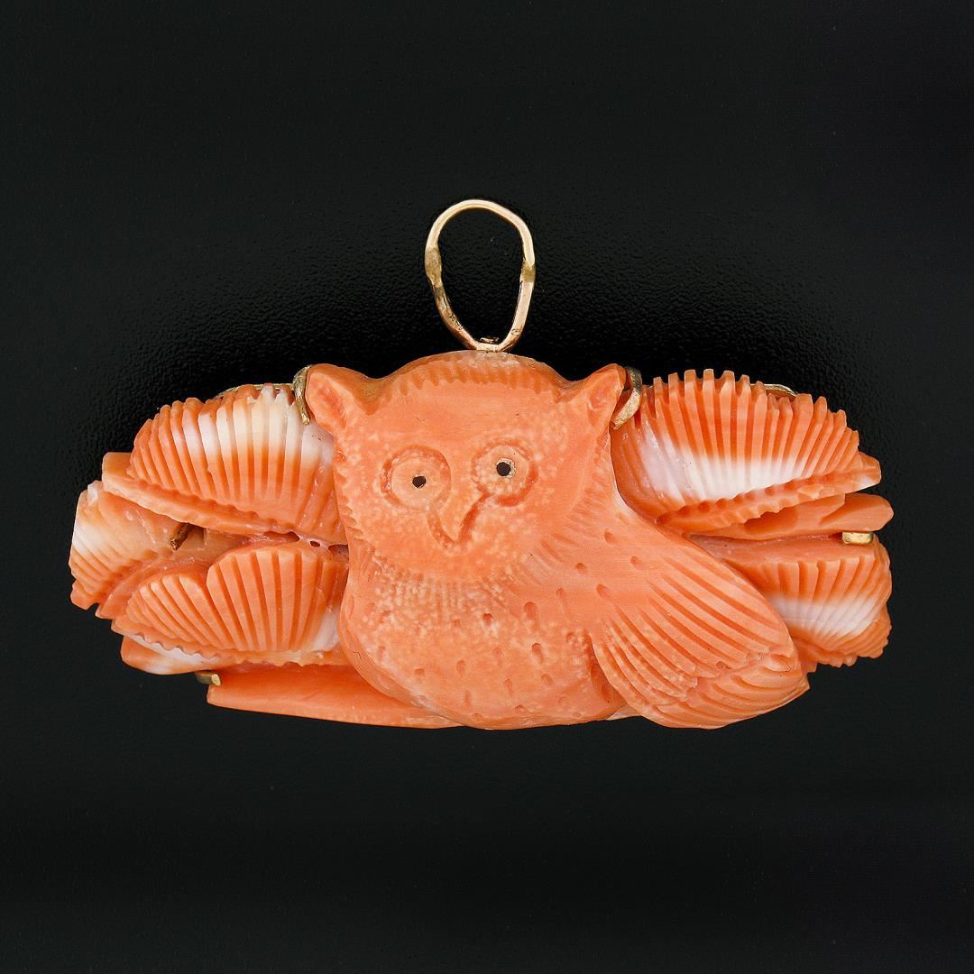 A vintage solid 14k yellow gold pendan brooch, with 1 large GIA graded hand carved owl coral cameo (53.21 x 27.44 x 12.28 mm ). Measures 34.30x53.2mm and weighs a total of 26.41 grams. Comes with all original relevant certifications.