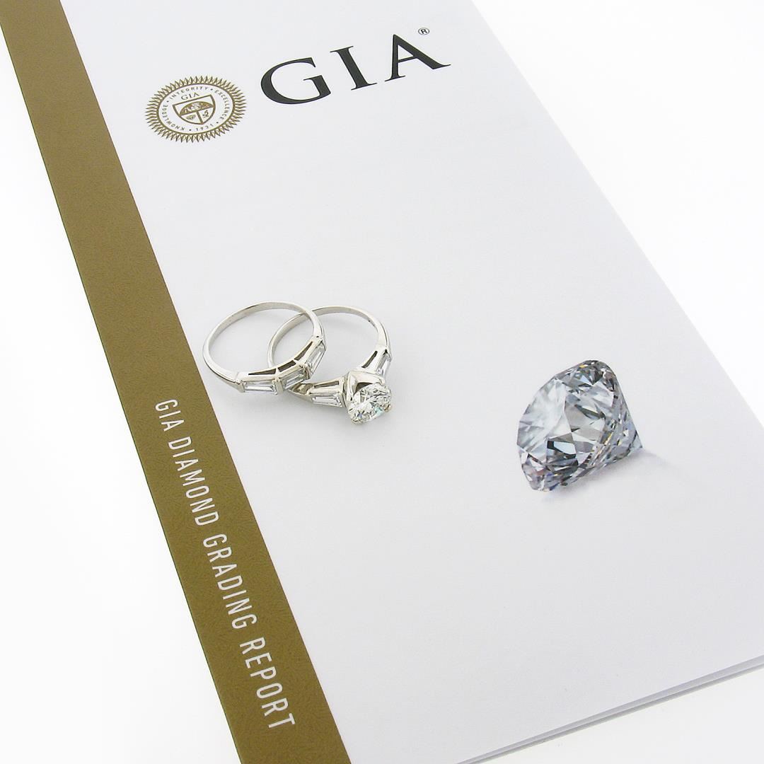 A vintage solid 14k white gold engagement wedding band ring set, with 1 GIA graded round brilliant cut natural diamond ( H - SI1 ; 1.64ct), and 5 straight & tapered baguette cut natural diamonds (G/H - VS1/VS2 ; 1.30ctw). The ring is size 7.0, weighs a total of 4.82 grams, and measures 3.2mm wide. Comes with all original relevant certifications.
