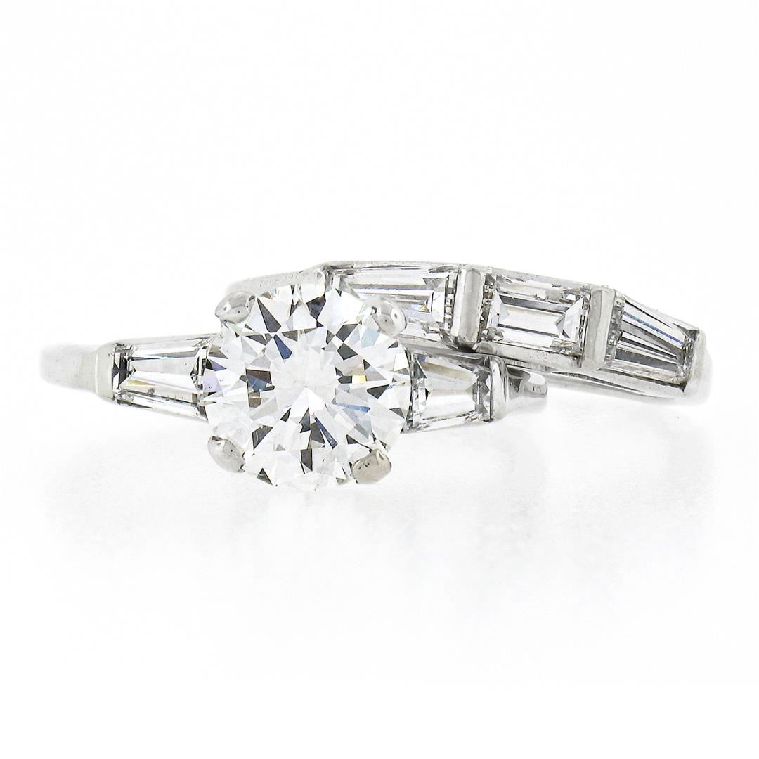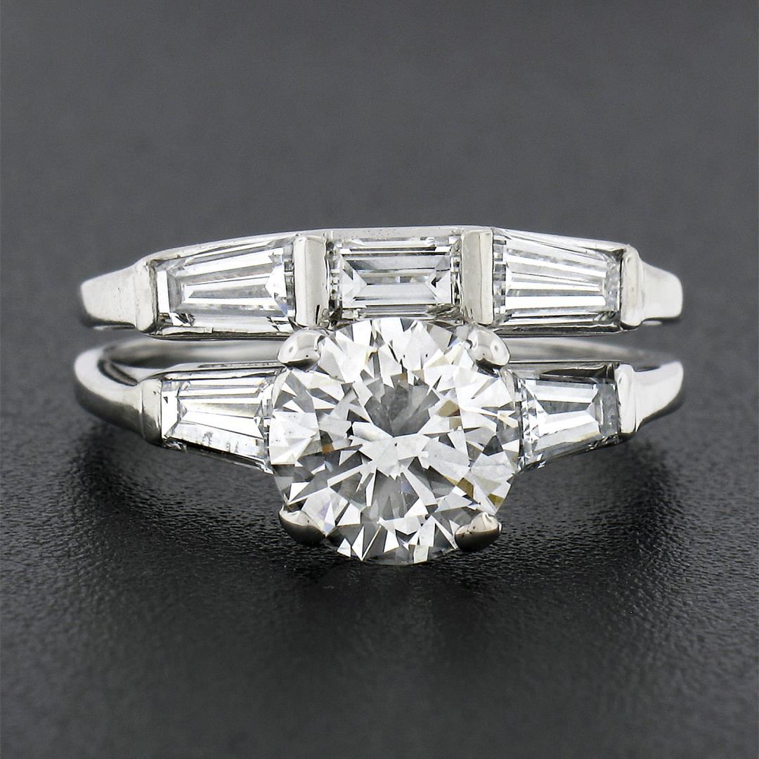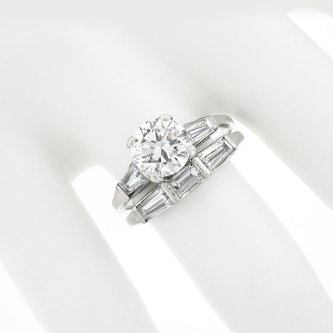 A vintage solid 14k white gold engagement wedding band ring set, with 1 GIA graded round brilliant cut natural diamond ( H - SI1 ; 1.64ct), and 5 straight & tapered baguette cut natural diamonds (G/H - VS1/VS2 ; 1.30ctw). The ring is size 7.0, weighs a total of 4.82 grams, and measures 3.2mm wide. Comes with all original relevant certifications.