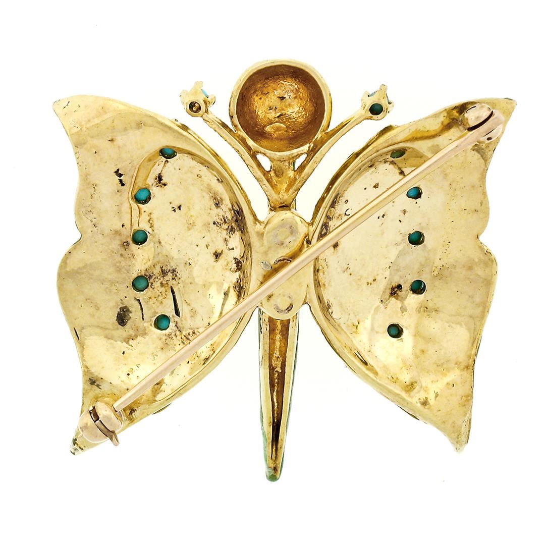 A vintage solid 14k yellow gold butterfly brooch, with 12 round bead bead shape natural turquoise (1.5mm to 2.0mm), with multi color enamel work. Measures 40.88x43.17mm and weighs a total of 11.32 grams.