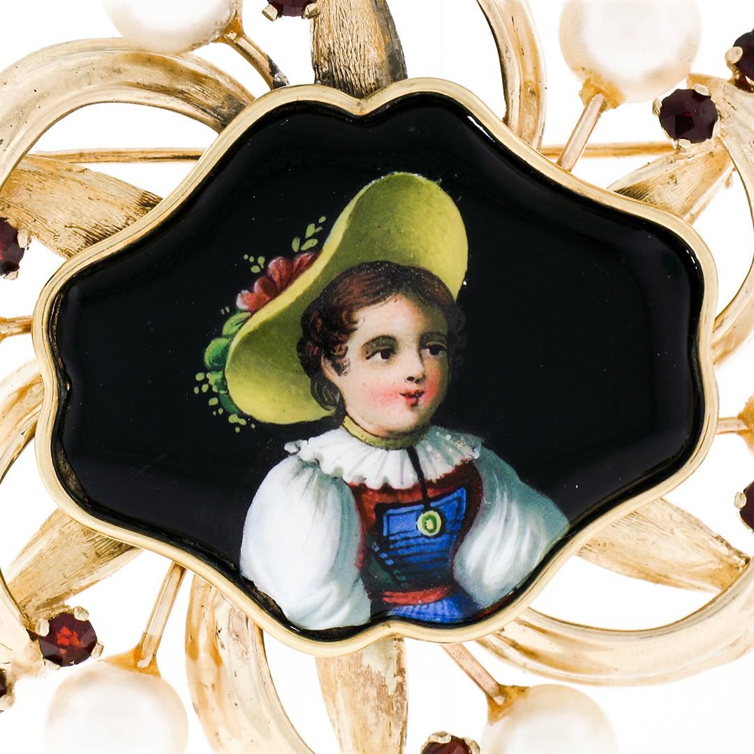 A vintage 14k yellow gold pendant or brooch featuring a hand-painted portrait surrounded by 6 round cultured pearls (6.50 to 6.75mm) and 18 round rose cut garnets (1.80ctw). The pendant weighs a total of 18.07 grams and measures 50.10x47.75mm including the bail.