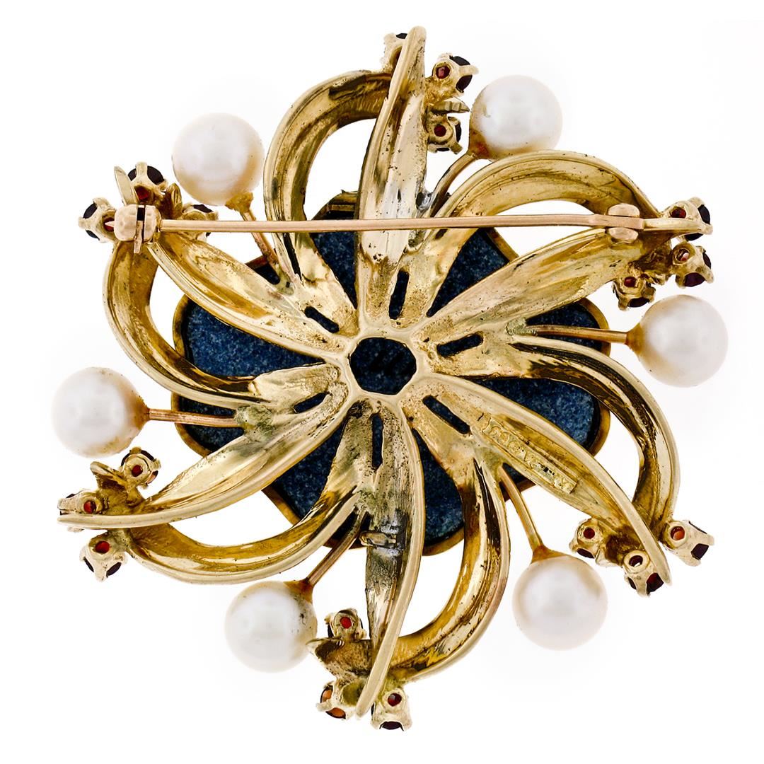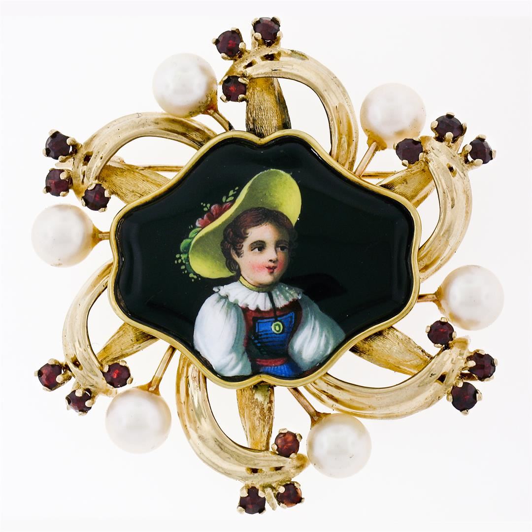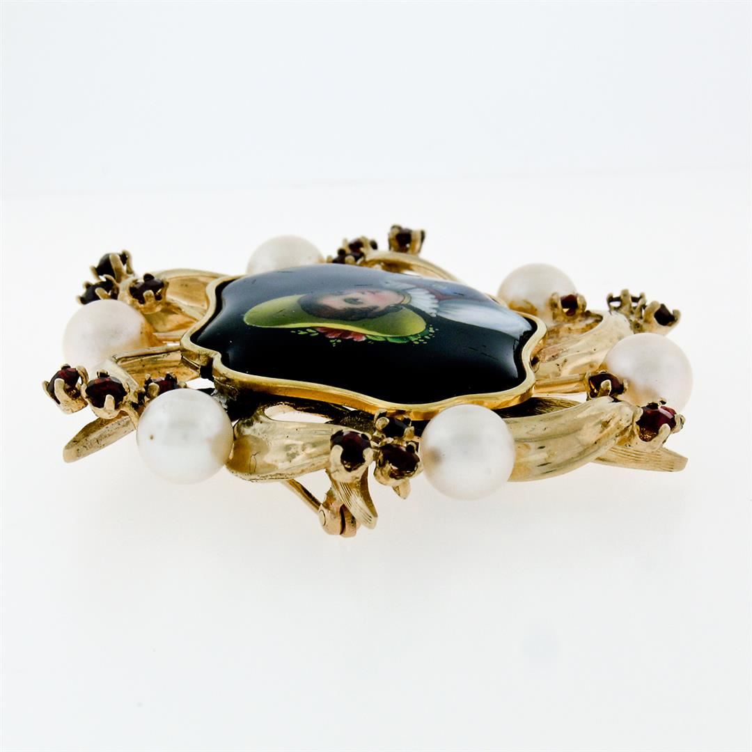 A vintage 14k yellow gold pendant or brooch featuring a hand-painted portrait surrounded by 6 round cultured pearls (6.50 to 6.75mm) and 18 round rose cut garnets (1.80ctw). The pendant weighs a total of 18.07 grams and measures 50.10x47.75mm including the bail.