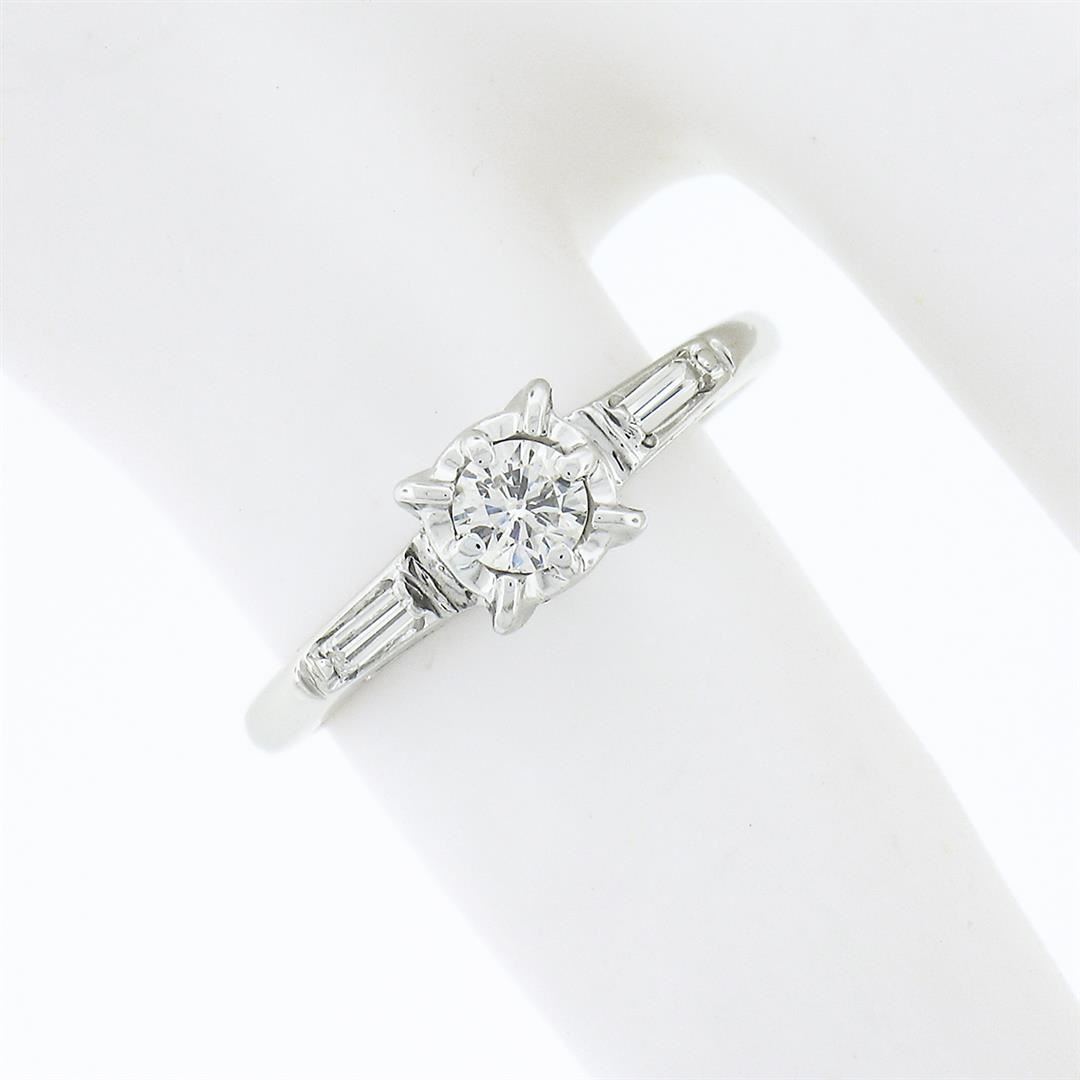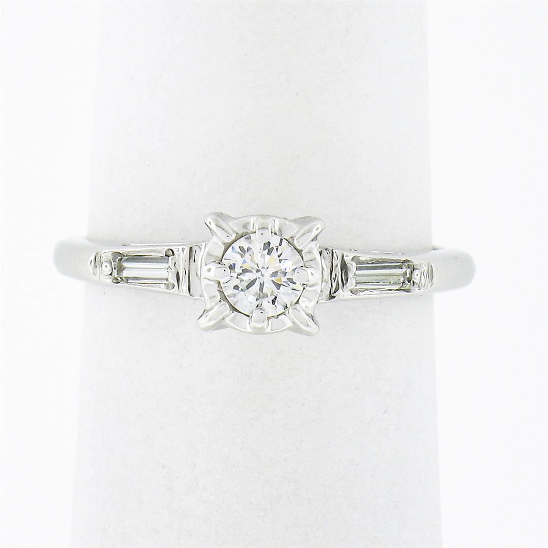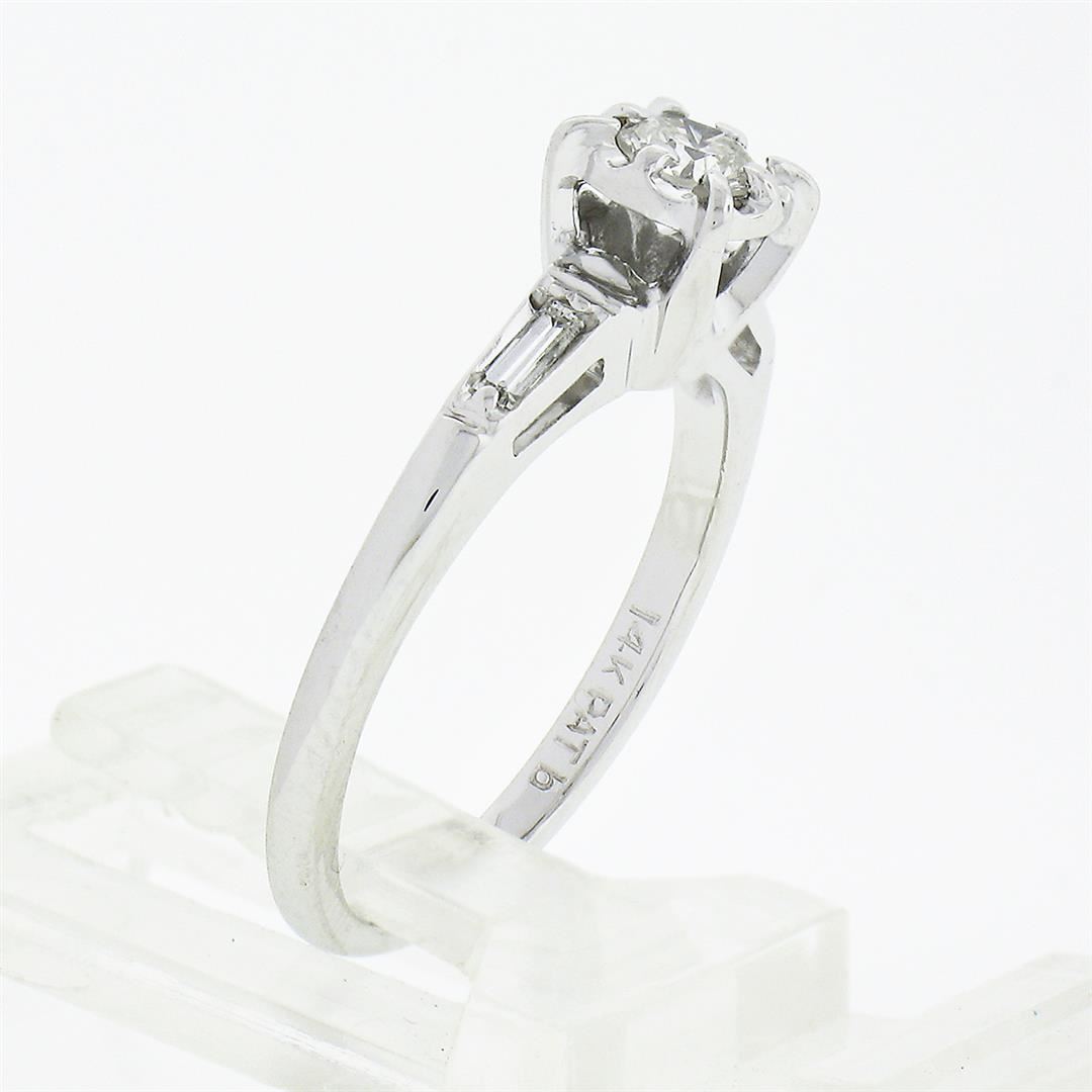 A solid 14k white gold engagement ring, with 1 old transitional cut natural diamond (H- VS2 ; 0.22ct), and 2 straight baguatte cut natural diamonds (G/H - VS1/VS2 ; 0.20ctw). The ring is size 5.0, weighs a total of 2.12 grams, and measures 5.20mm wide.
