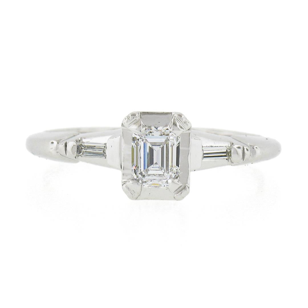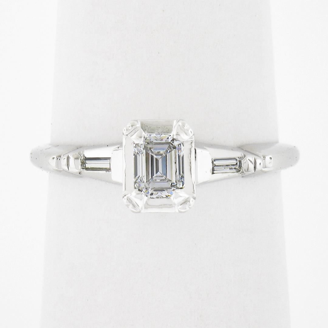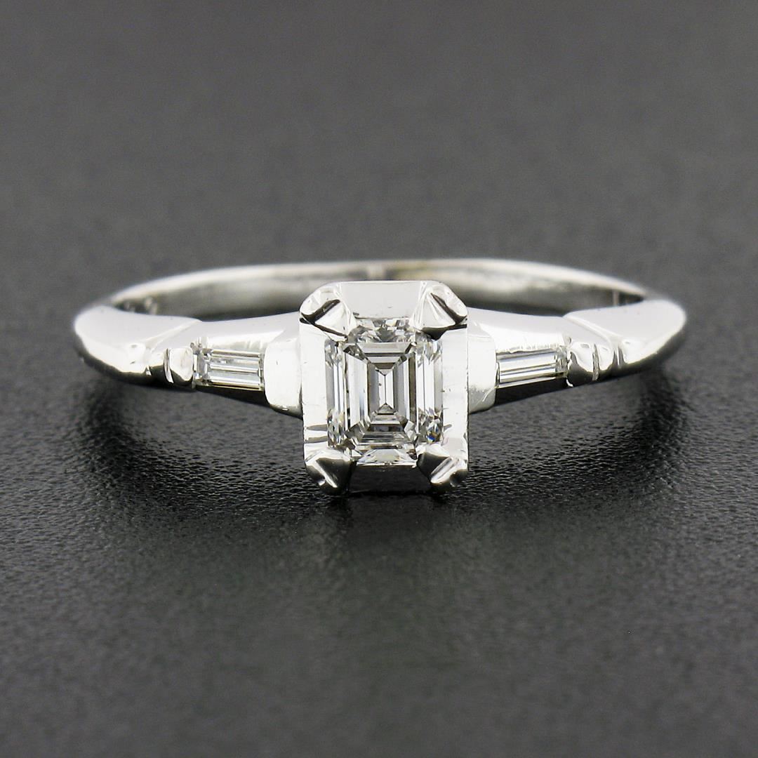 A vintage solid 14k white gold ring, with 1 emerald cut natural diamond (G - VS2 ; 4.48x3.52mm / 0.28ct), and 2 baguette cut natural diamonds (G/H- VS1/VS2 ; 0.04ctw ). The ring is size 6.5, weighs a total of 2.23 grams, and measures 6.5mm wide.