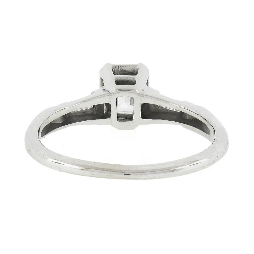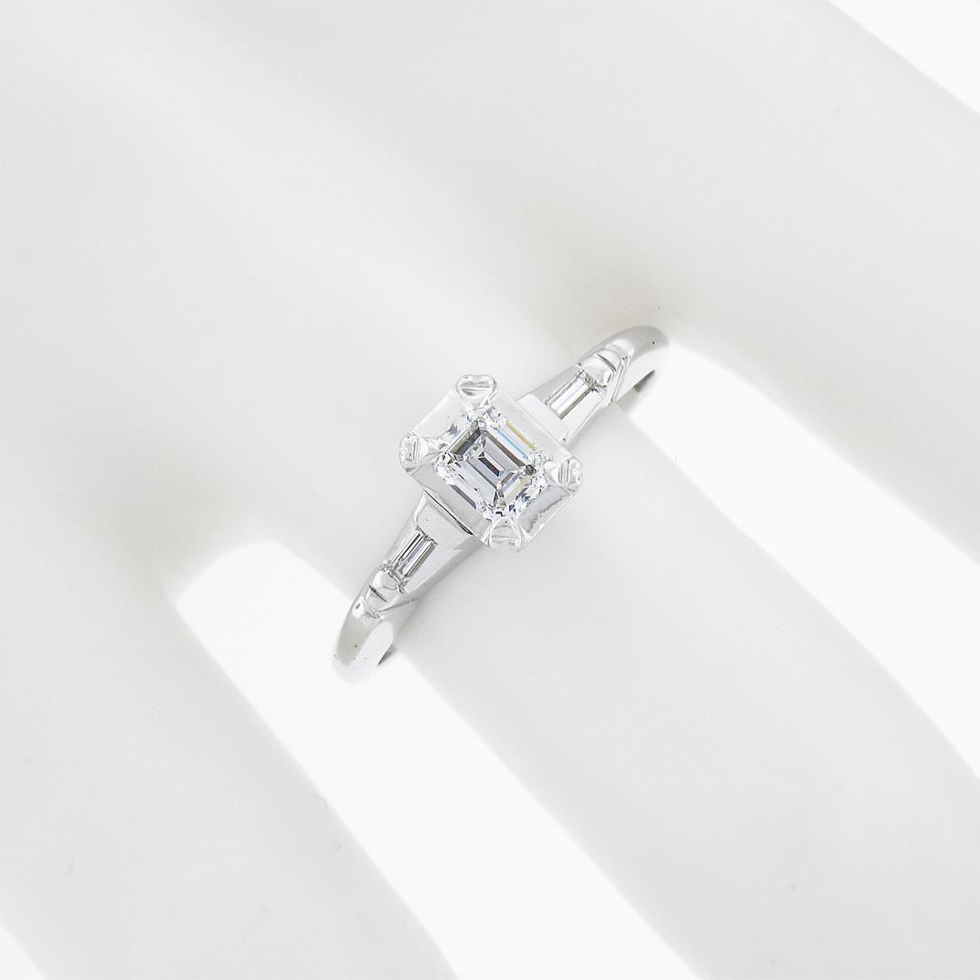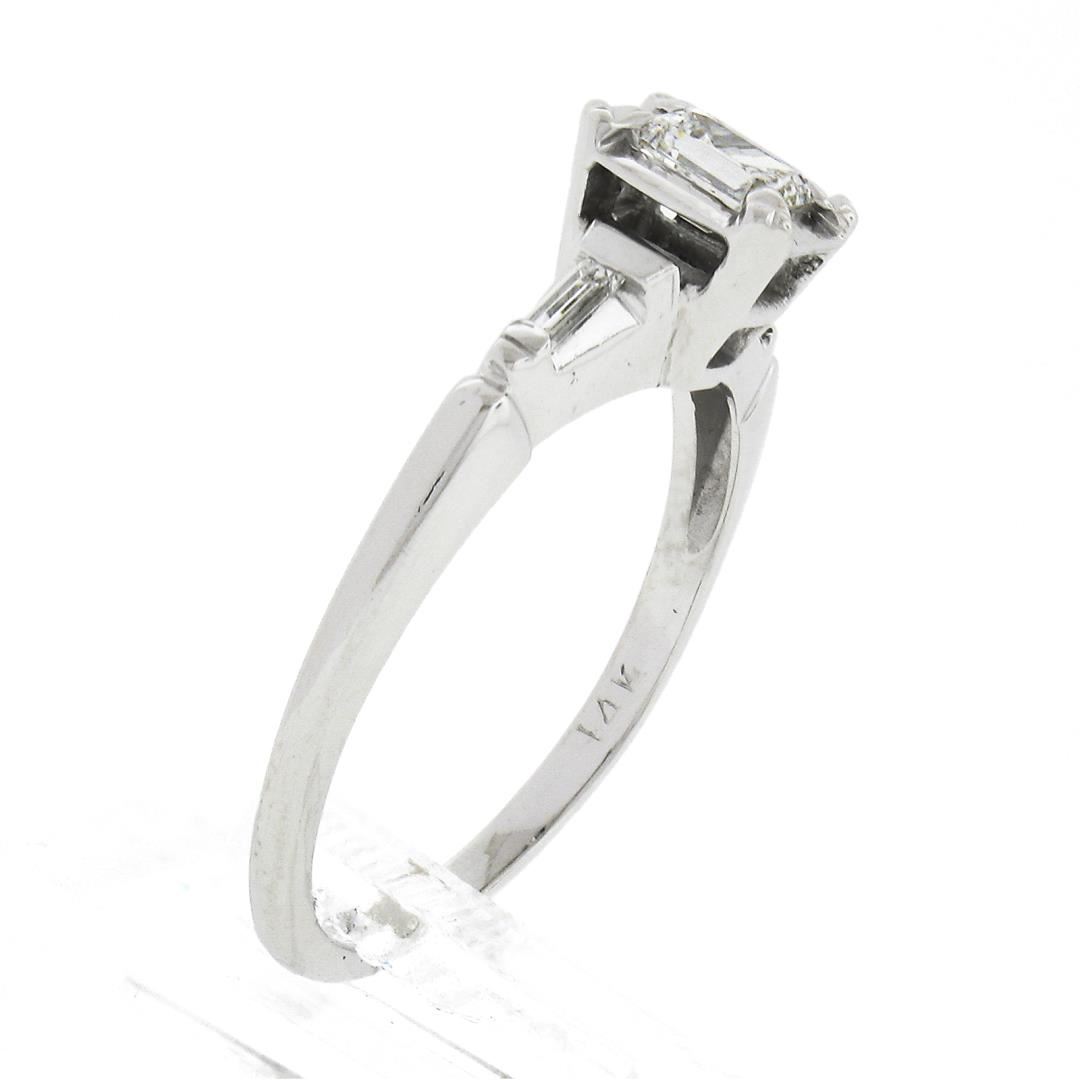 A vintage solid 14k white gold ring, with 1 emerald cut natural diamond (G - VS2 ; 4.48x3.52mm / 0.28ct), and 2 baguette cut natural diamonds (G/H- VS1/VS2 ; 0.04ctw ). The ring is size 6.5, weighs a total of 2.23 grams, and measures 6.5mm wide.