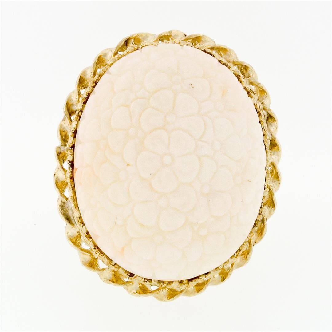 A vintage solid 14k yellow gold ring featuring a large natural angel skin coral (29.12x23.60mm) with a hand carved flower motif. The ring is size 5.5, weighs a total of 20.37 grams, and measures 34.07mm wide.