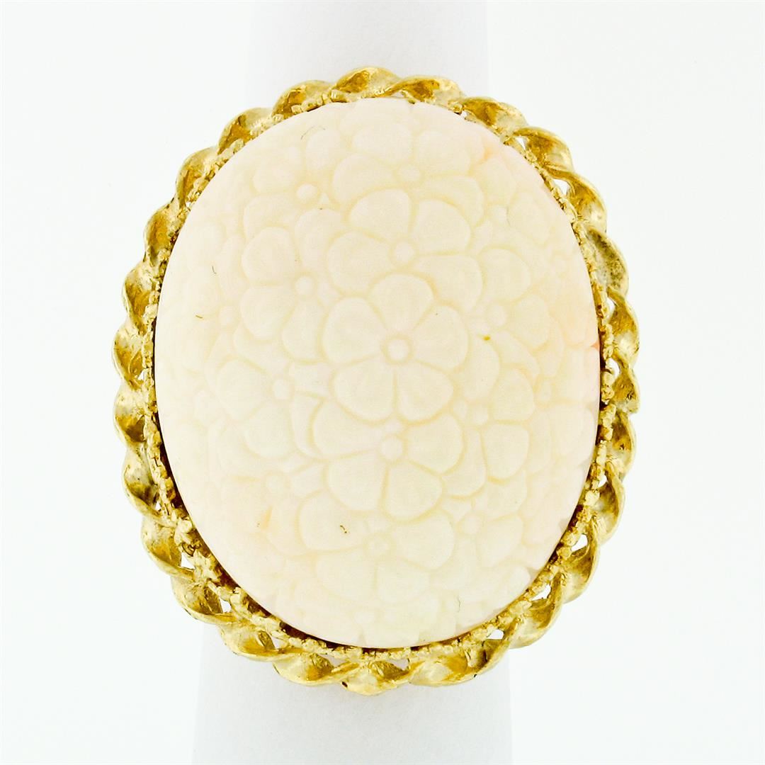 A vintage solid 14k yellow gold ring featuring a large natural angel skin coral (29.12x23.60mm) with a hand carved flower motif. The ring is size 5.5, weighs a total of 20.37 grams, and measures 34.07mm wide.