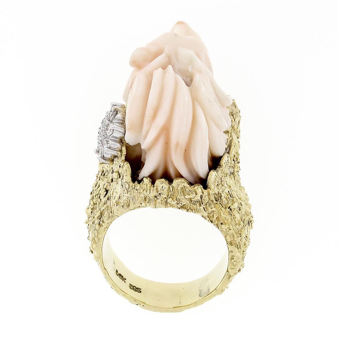 A vintage solid 14k yellow gold statement ring, with 1 lion's head carved natural coral ( 27x16.3mm), and 9 old single cut natural diamonds (I - SI2/I1 ; 0.29ctw). The ring is size 8, weighs a total of 24.06 grams, and measures 27mm wide.