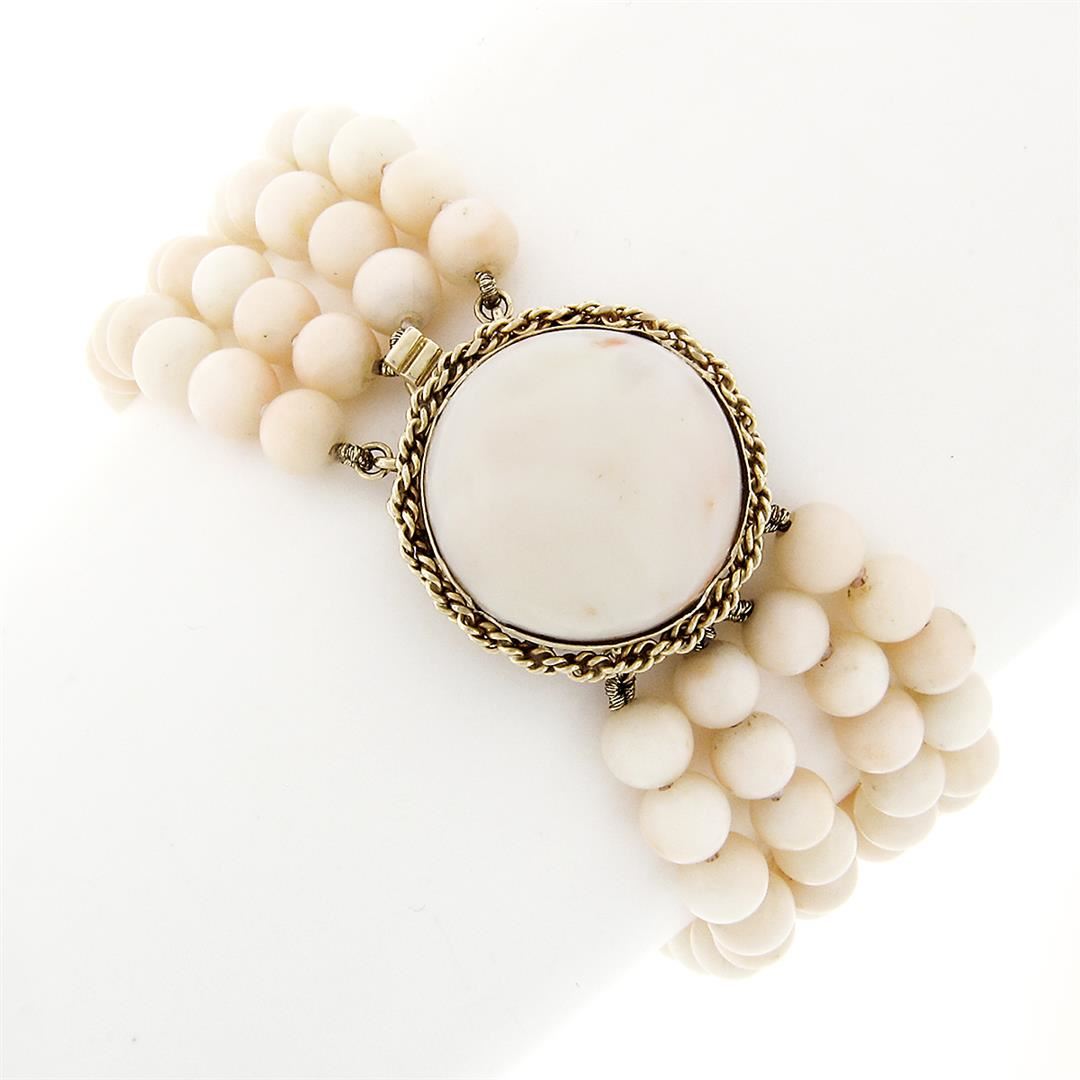 A vintage solid 14k yellow gold 4 strand bracelet, with 1 round cabochon cut natural coral (18mm), and 102 round bead shape natural coral (5.2-5.7mm). It weighs a total of 32.45 grams, measures 22.2mm wide, and measures 6 inches in length.