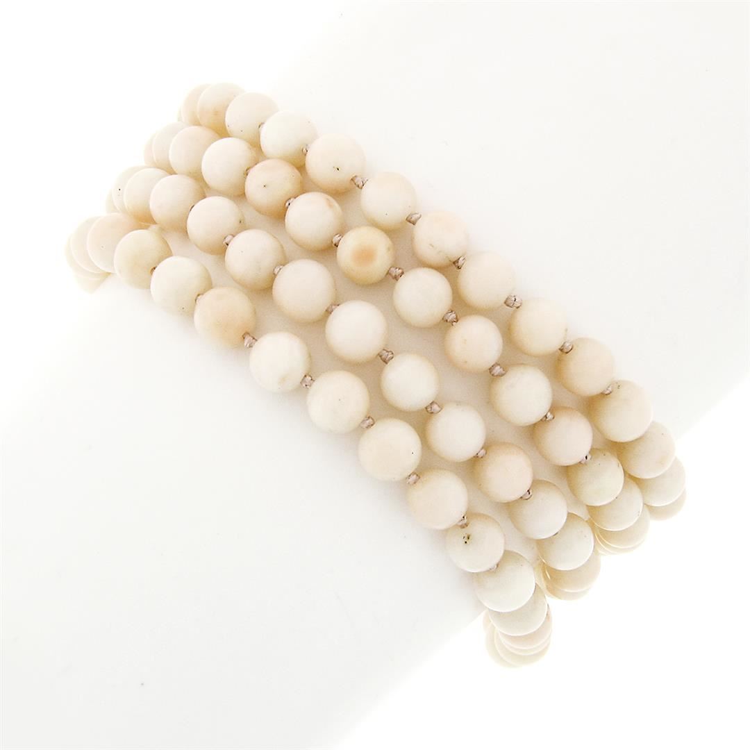 A vintage solid 14k yellow gold 4 strand bracelet, with 1 round cabochon cut natural coral (18mm), and 102 round bead shape natural coral (5.2-5.7mm). It weighs a total of 32.45 grams, measures 22.2mm wide, and measures 6 inches in length.