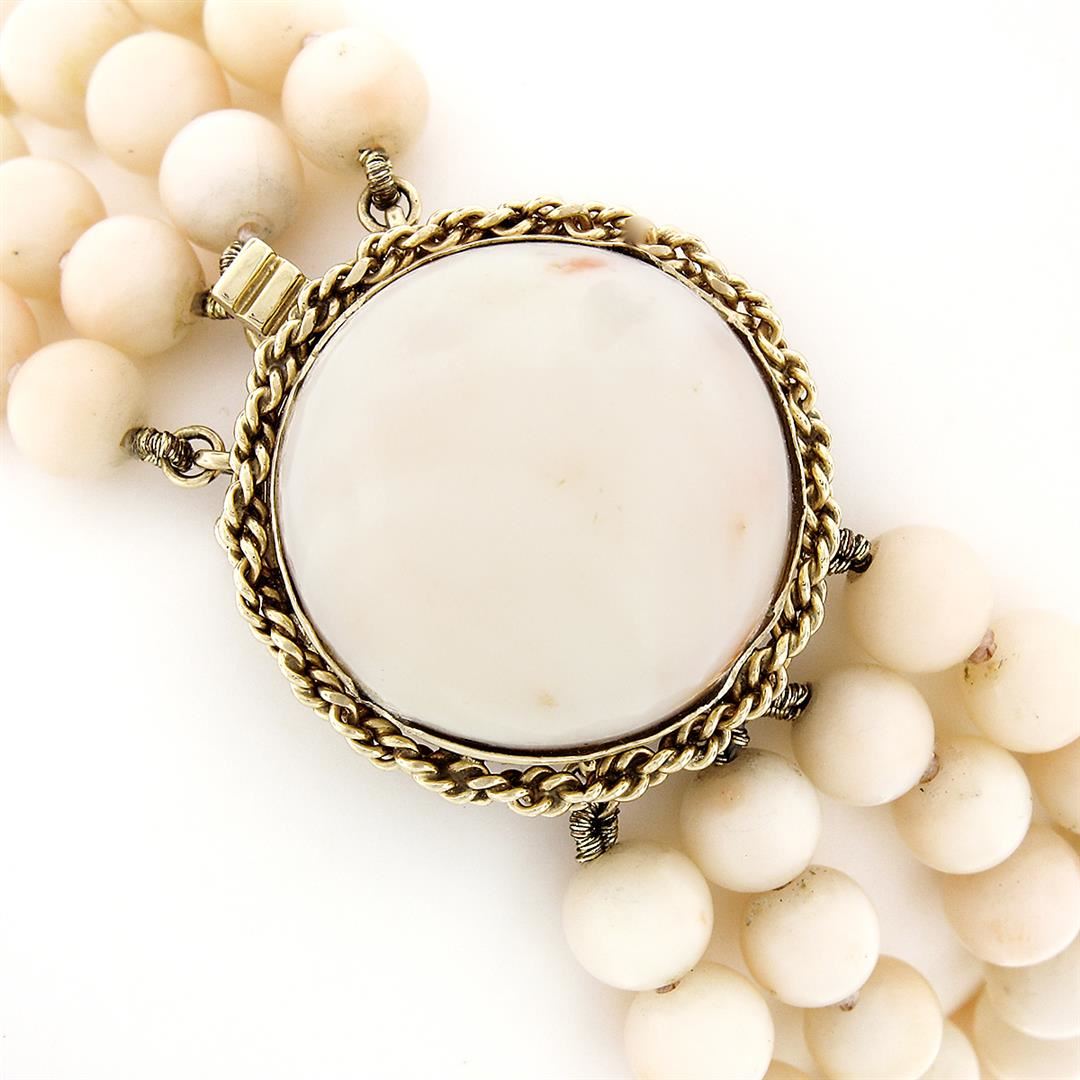 A vintage solid 14k yellow gold 4 strand bracelet, with 1 round cabochon cut natural coral (18mm), and 102 round bead shape natural coral (5.2-5.7mm). It weighs a total of 32.45 grams, measures 22.2mm wide, and measures 6 inches in length.
