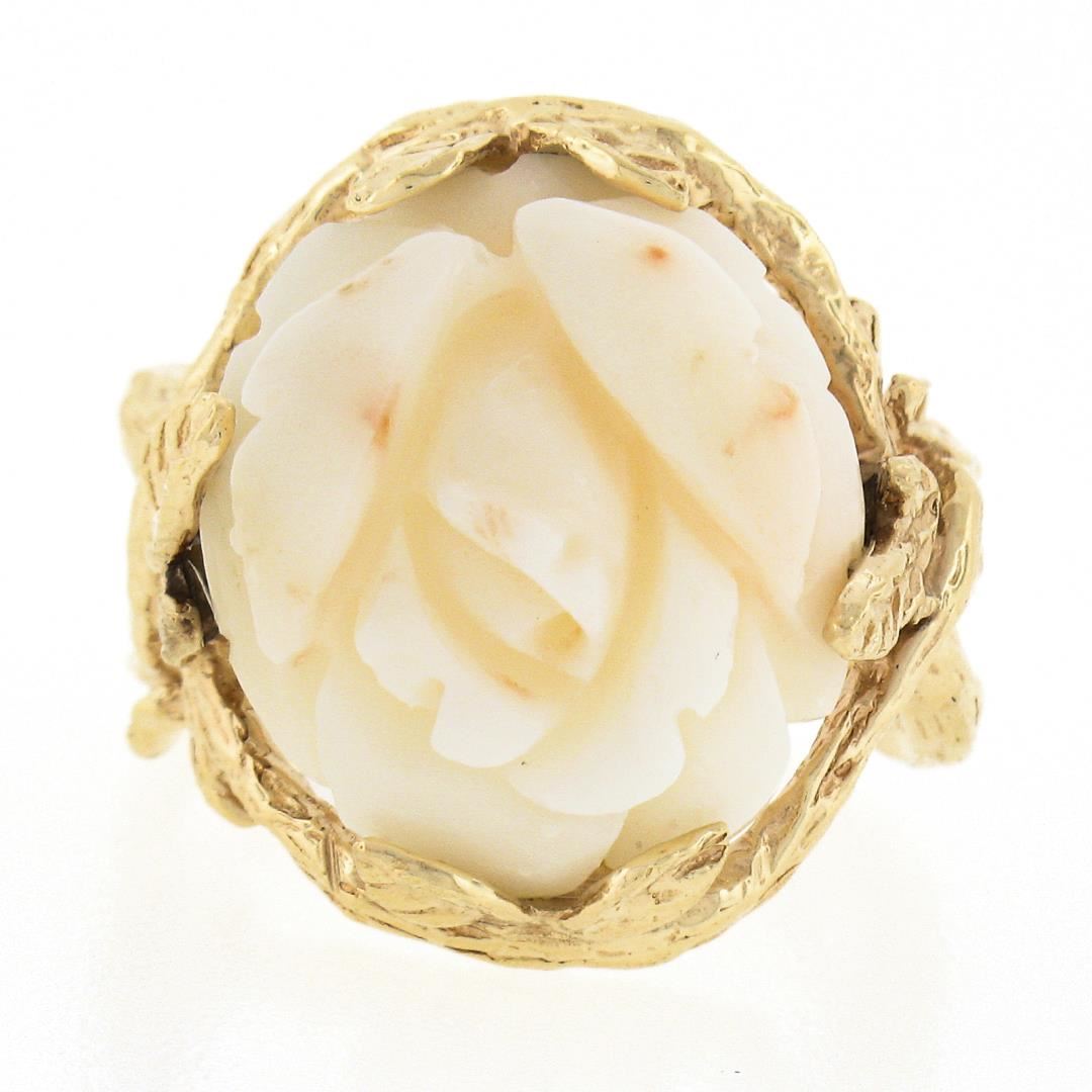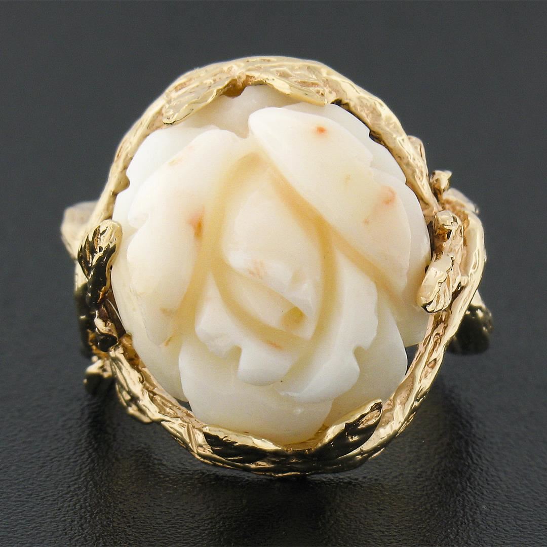 A vintage solid 14k yellow gold ring, with 1 carved rose natural coral (17.3x15.2mm). The ring is size 6.0, weighs a total of 7.95 grams, and measures 20.3mm wide.