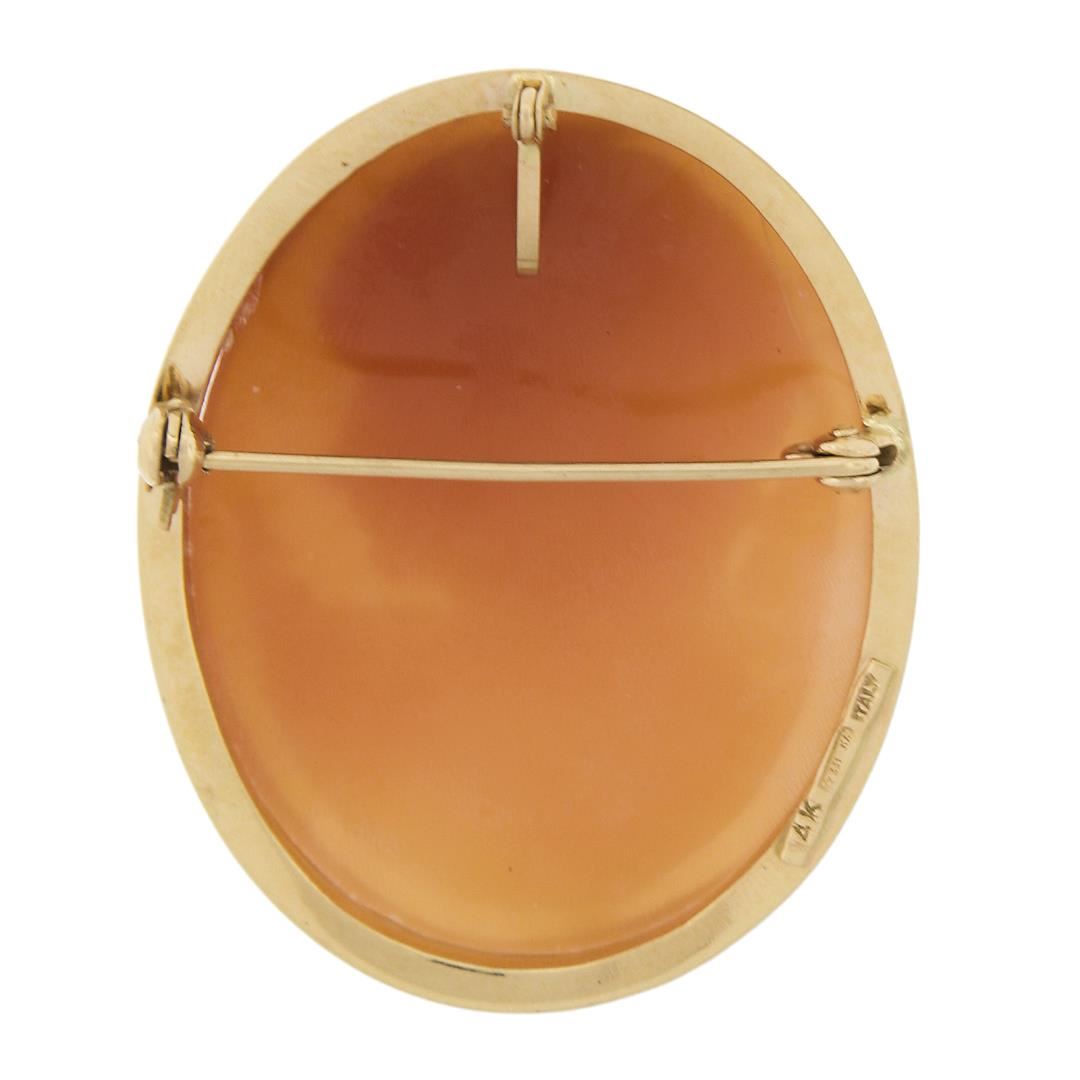 A vintage solid 14k yellow gold brooch pendant, with 1 oval carved cameo shell (34.1x26.8mm). Measures 43.9x30.7mm and weighs a total of 6.47 grams, and the inside bail dimension is 5.1x3mm