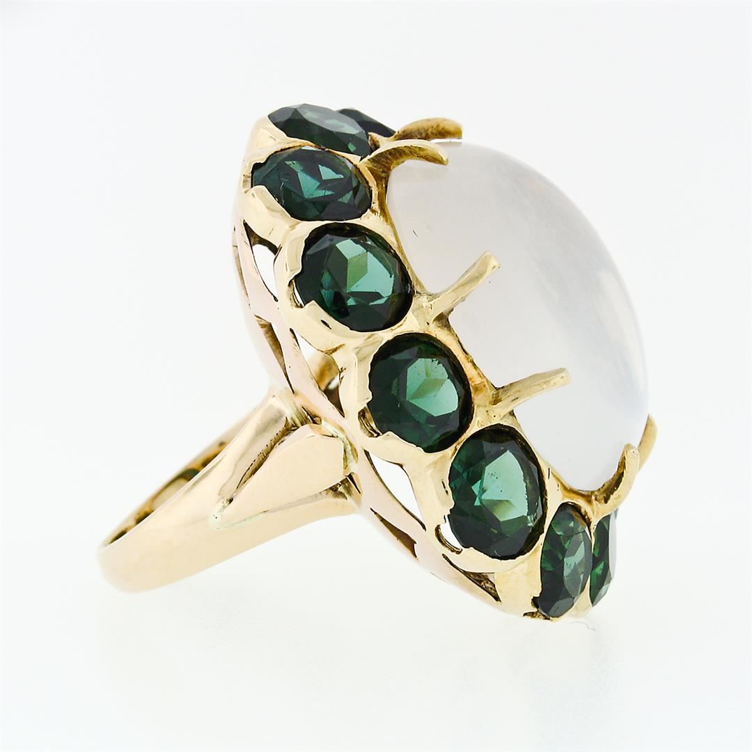 A vintage solid 14k yellow gold statement ring with 1 large oval cabochon cut natural moonstone (21.23x16.91mm), surronded with a halo of 12 round brilliant cut natural tourmalines (18.00ctw). The ring is size 6.5, weighs a total of 19.76 grams, and measures 32.68mm wide.
