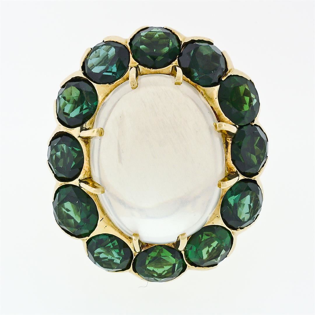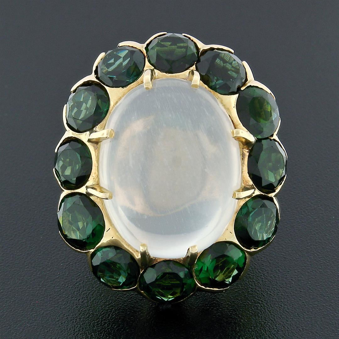 A vintage solid 14k yellow gold statement ring with 1 large oval cabochon cut natural moonstone (21.23x16.91mm), surronded with a halo of 12 round brilliant cut natural tourmalines (18.00ctw). The ring is size 6.5, weighs a total of 19.76 grams, and measures 32.68mm wide.