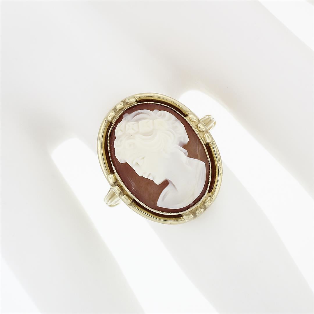 A vintage solid 14k yellow gold ring, featuring 1 oval shape natural carved shell. The ring is size 5.5, weighs a total of 4.14 grams, and measures 19.2mm wide.