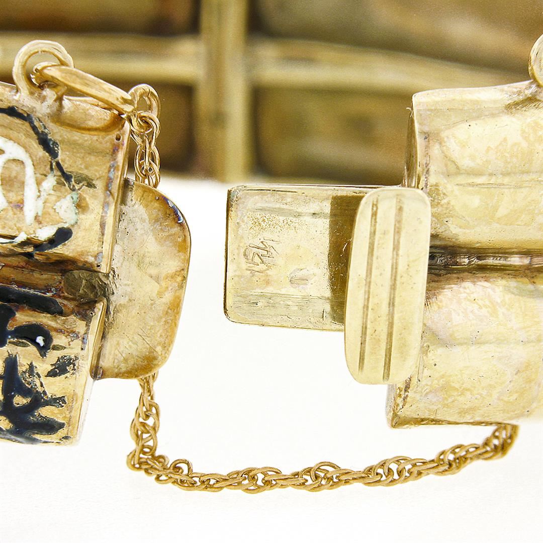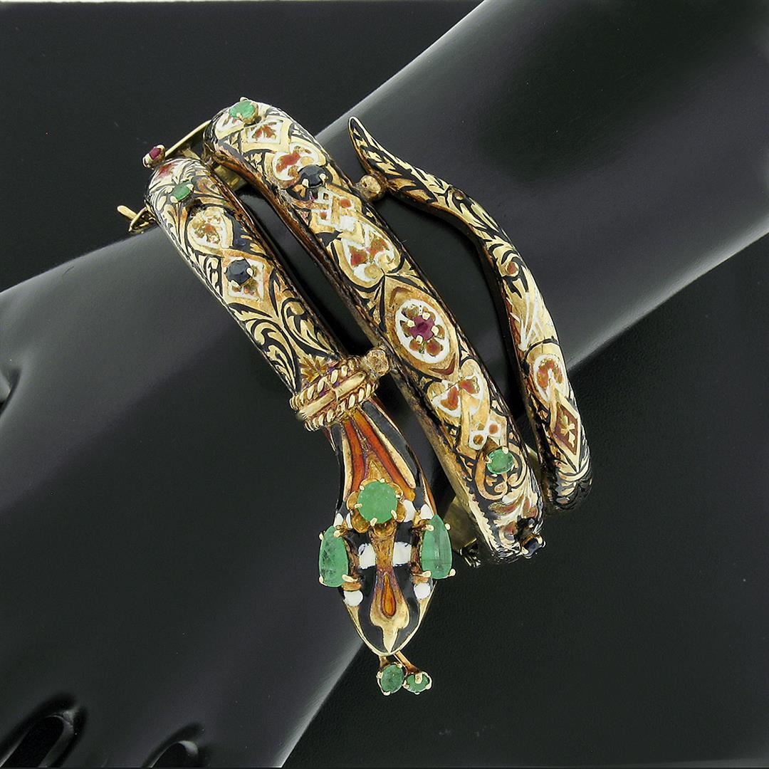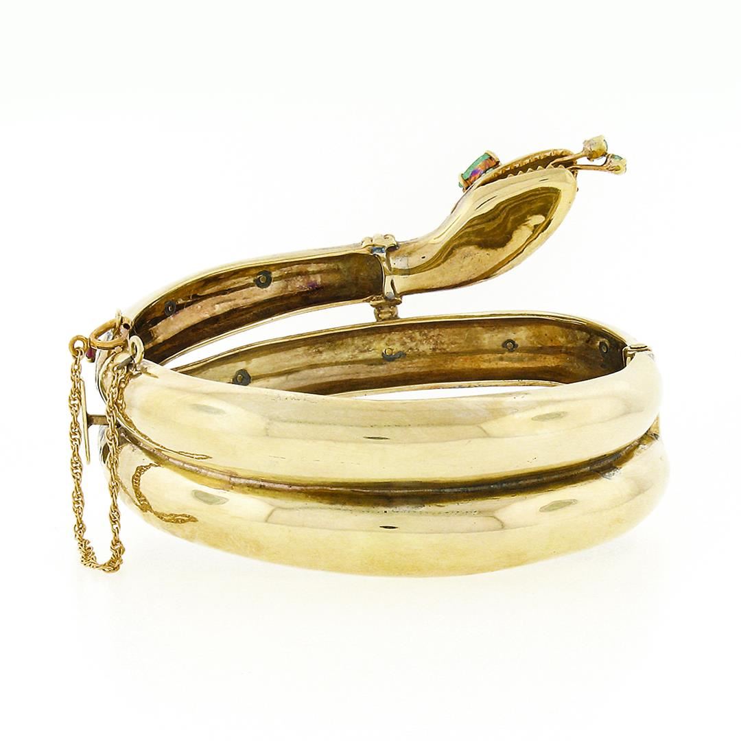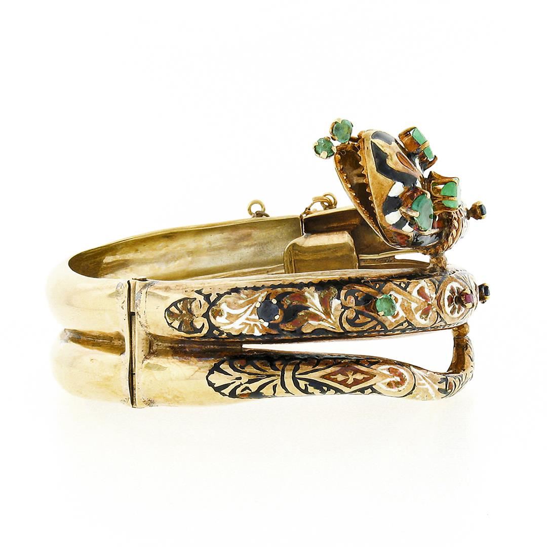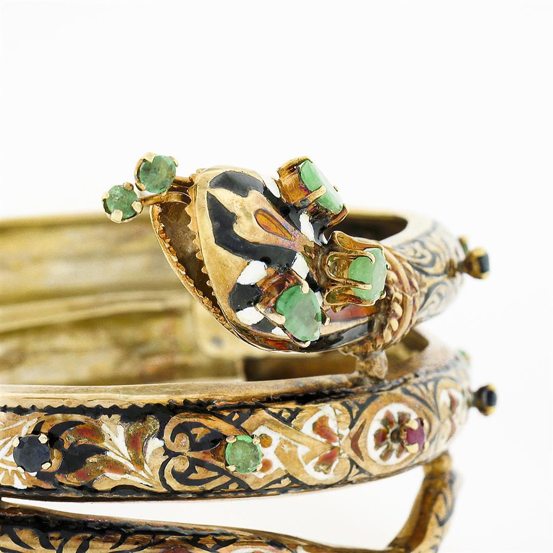 A vintage solid 14k yellow gold snake coiled bangle bracelet, with enamel work & 8 round and pear cut natural emeralds (1.70ctw), with 2 round brilliant cut natural rubies (0.30ctw), and 3 round brilliant cut natural sapphires (0.45ctw). It weighs a total of 71.66 grams, measures 43.80mm wide, and measures 7 inches in length.