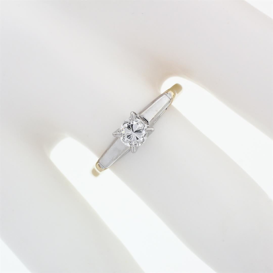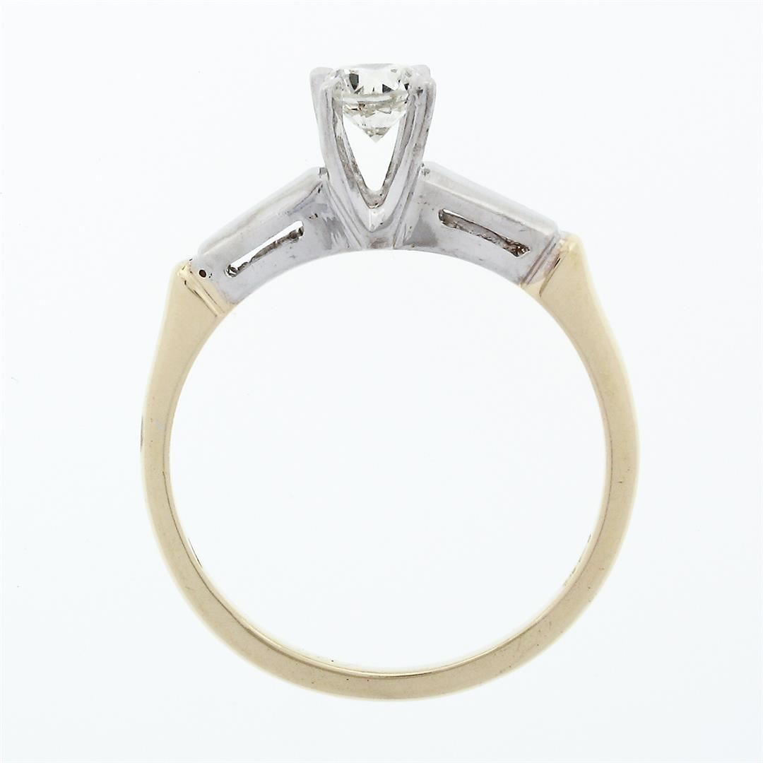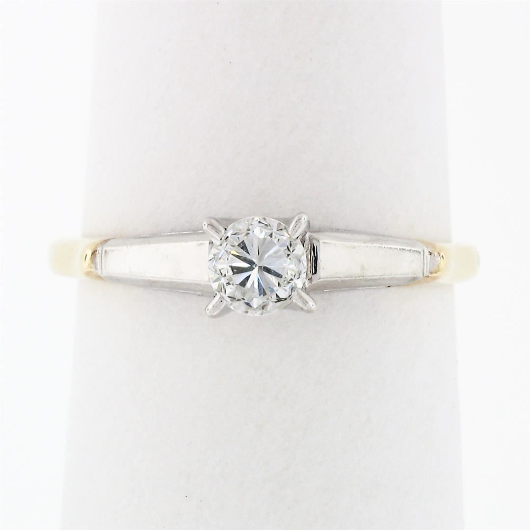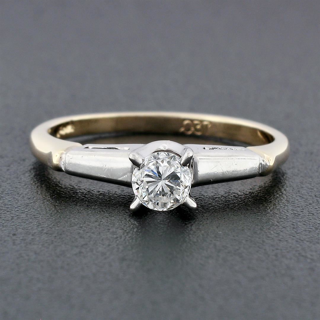 A solid 14k two tone gold solitaire ring, with 1 old round transitional cut natural diamond (G - SI2 ; 0.37ct). The ring is size 6.0, weighs a total of 2.2 grams, and measures 4.3mm wide.