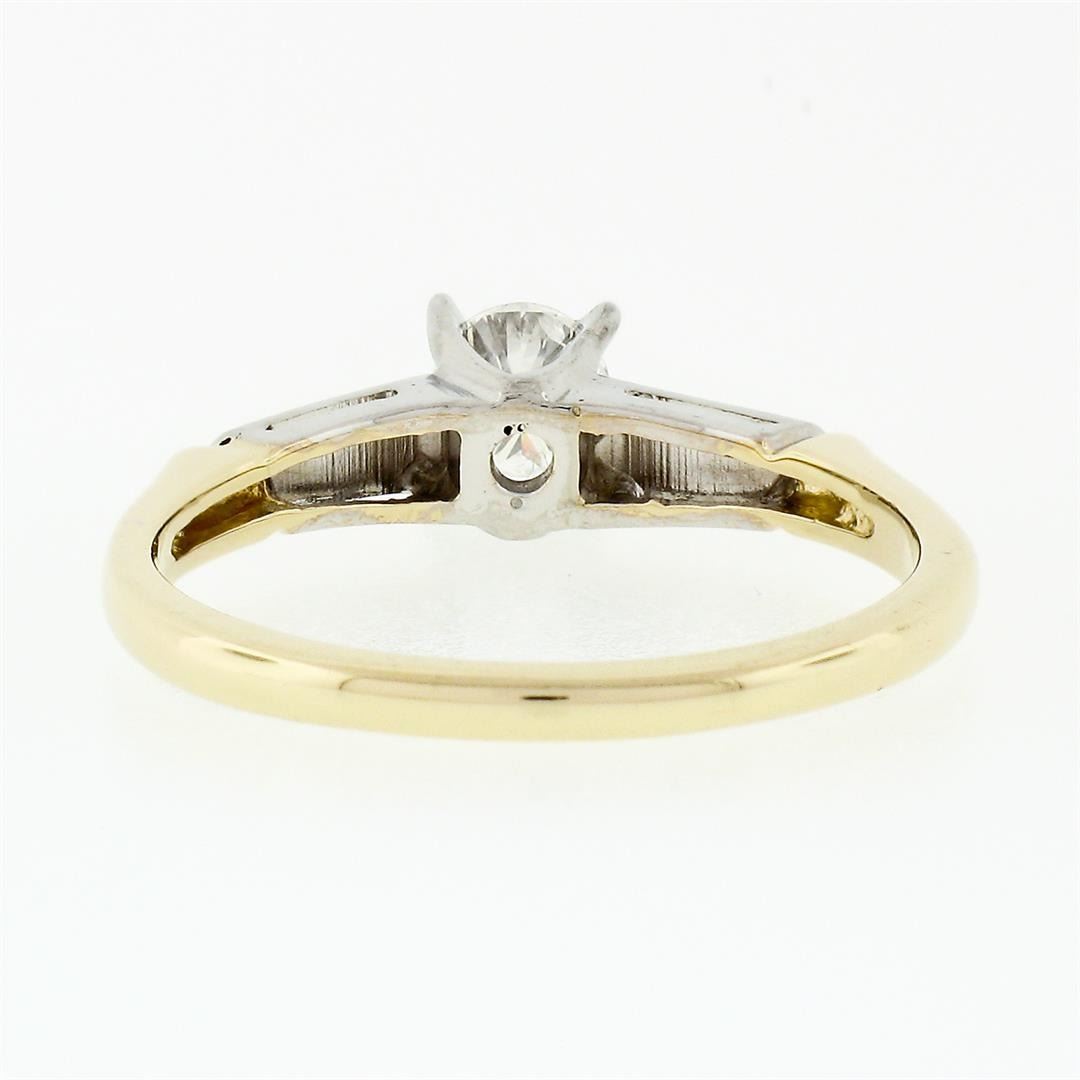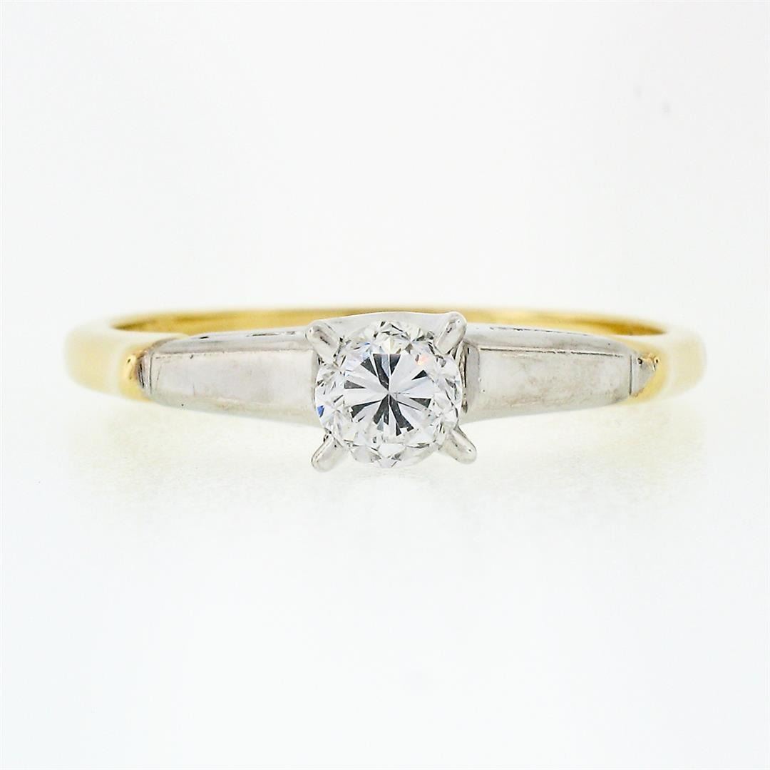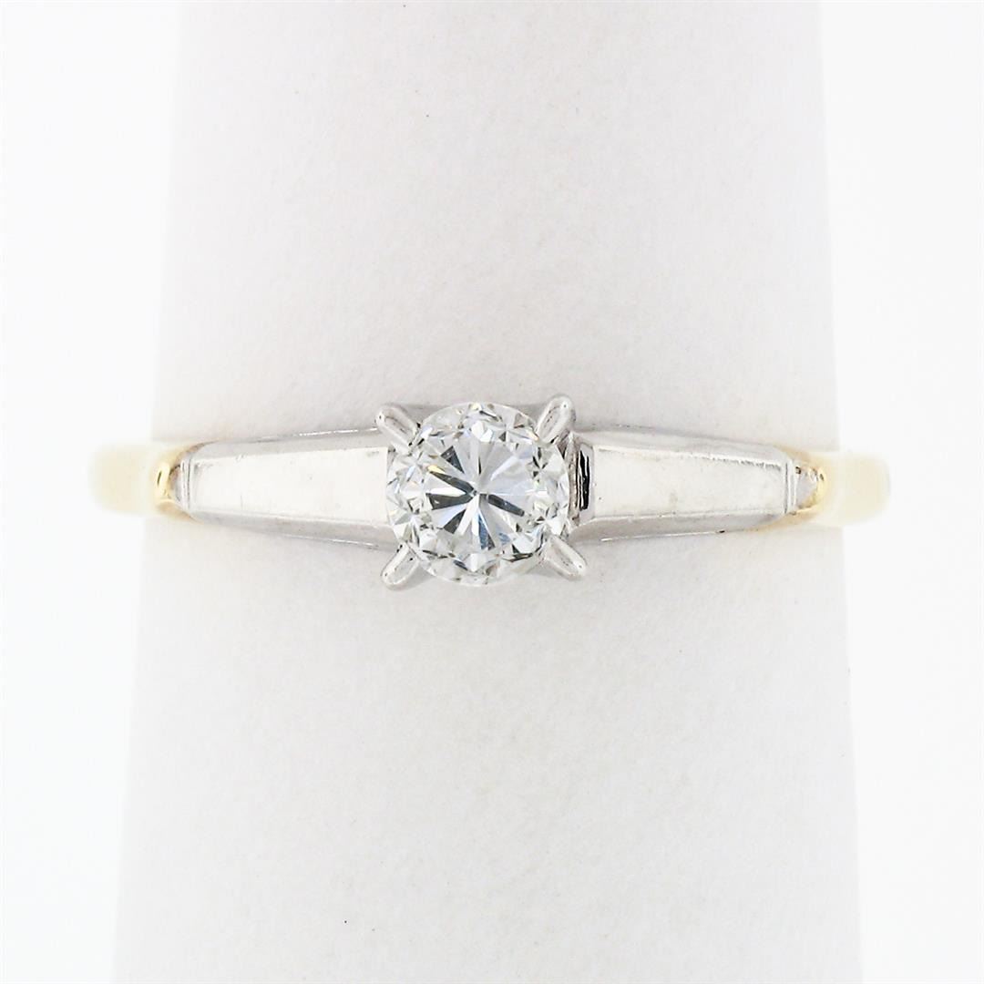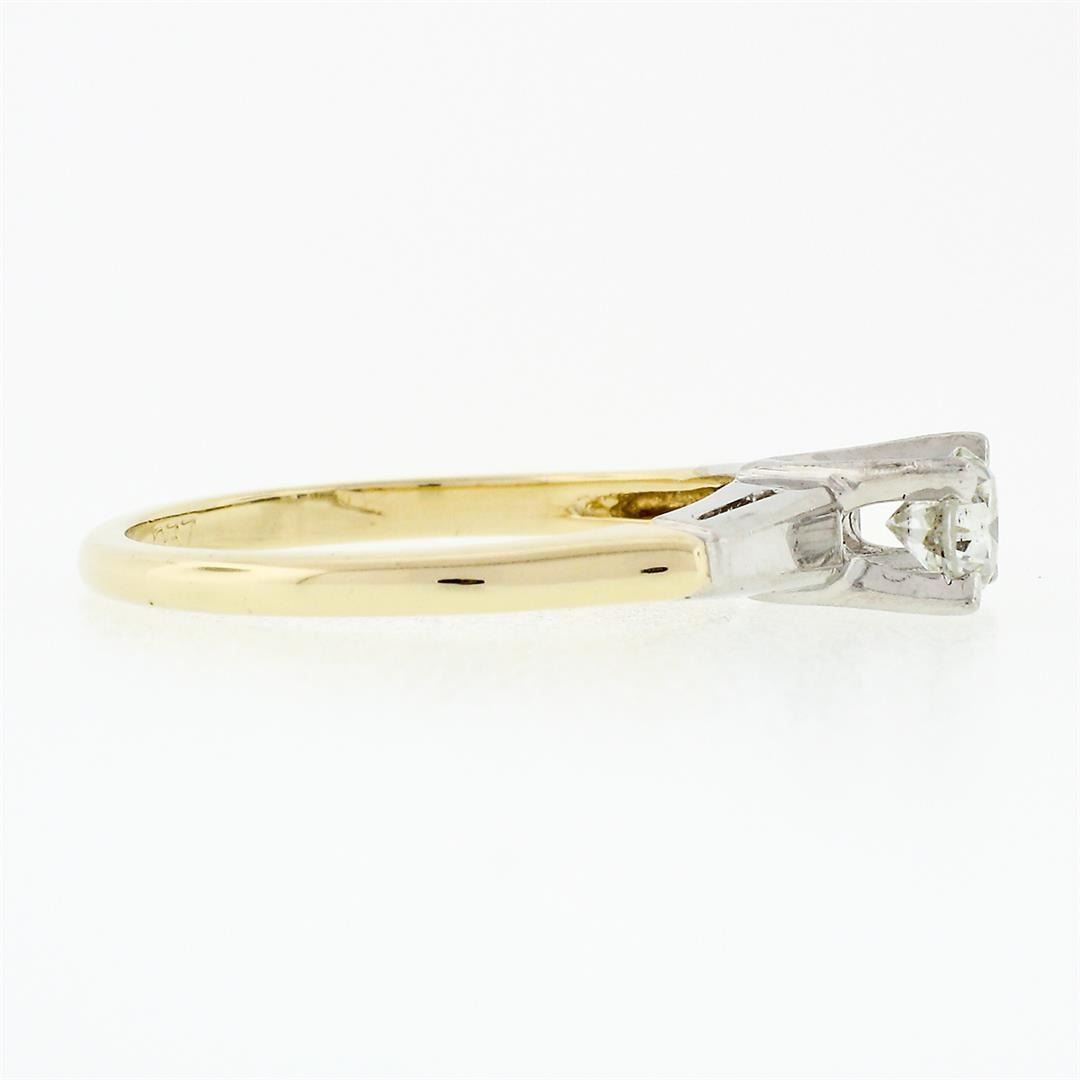 A solid 14k two tone gold solitaire ring, with 1 old round transitional cut natural diamond (G - SI2 ; 0.37ct). The ring is size 6.0, weighs a total of 2.2 grams, and measures 4.3mm wide.