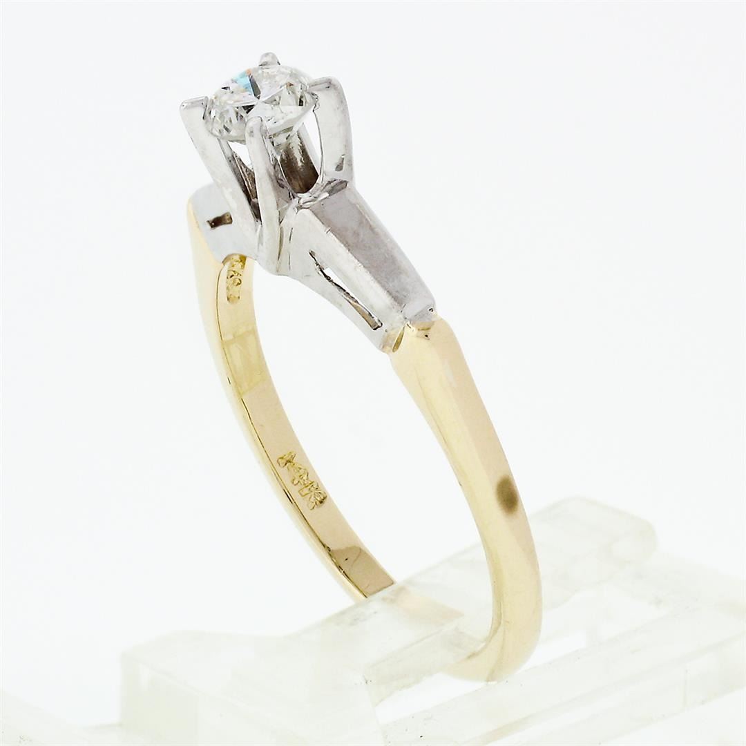 A solid 14k two tone gold solitaire ring, with 1 old round transitional cut natural diamond (G - SI2 ; 0.37ct). The ring is size 6.0, weighs a total of 2.2 grams, and measures 4.3mm wide.
