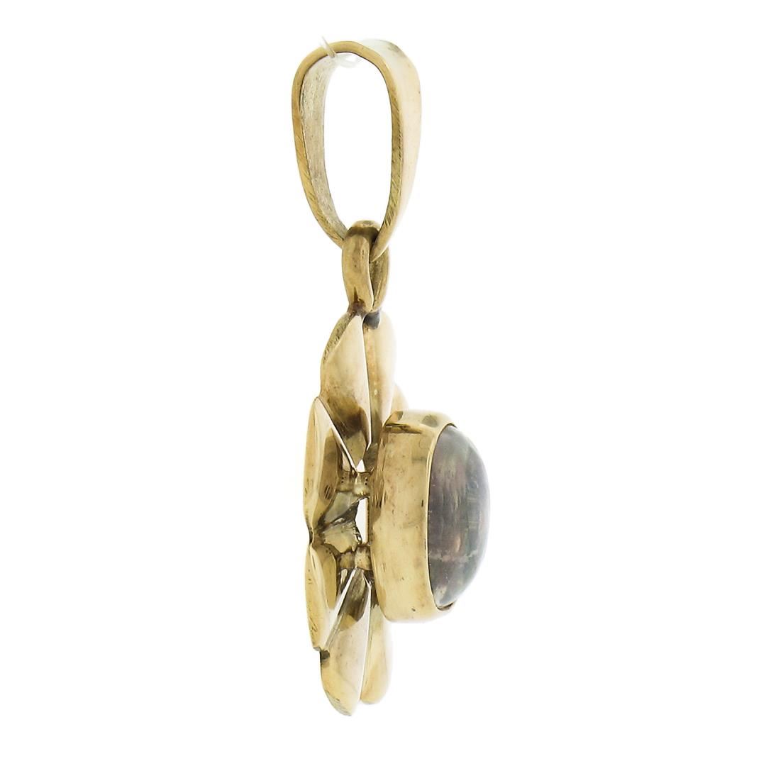 A vintage solid 14k rosy yellow gold pendant, with 1 oval cabochon cut natrual opal (7.4x5.9mm). The pendant weighs a total of 2.87 grams, measures 28.1x14.5mm including the bail.